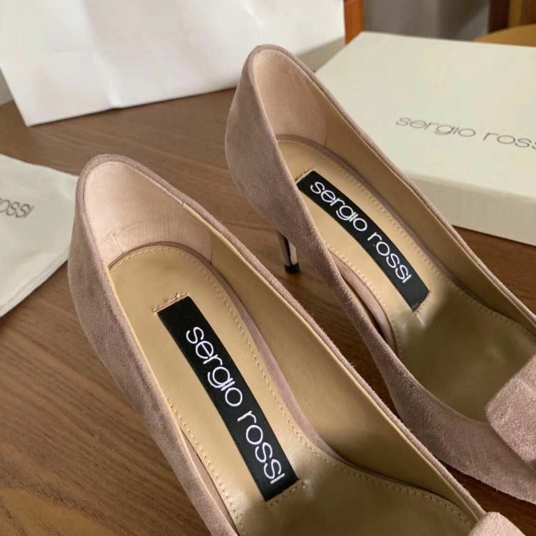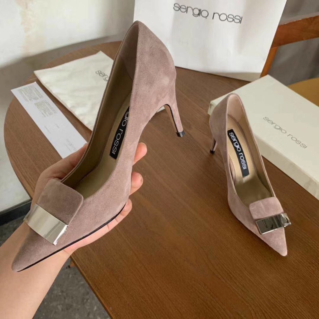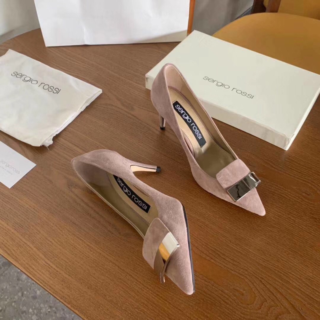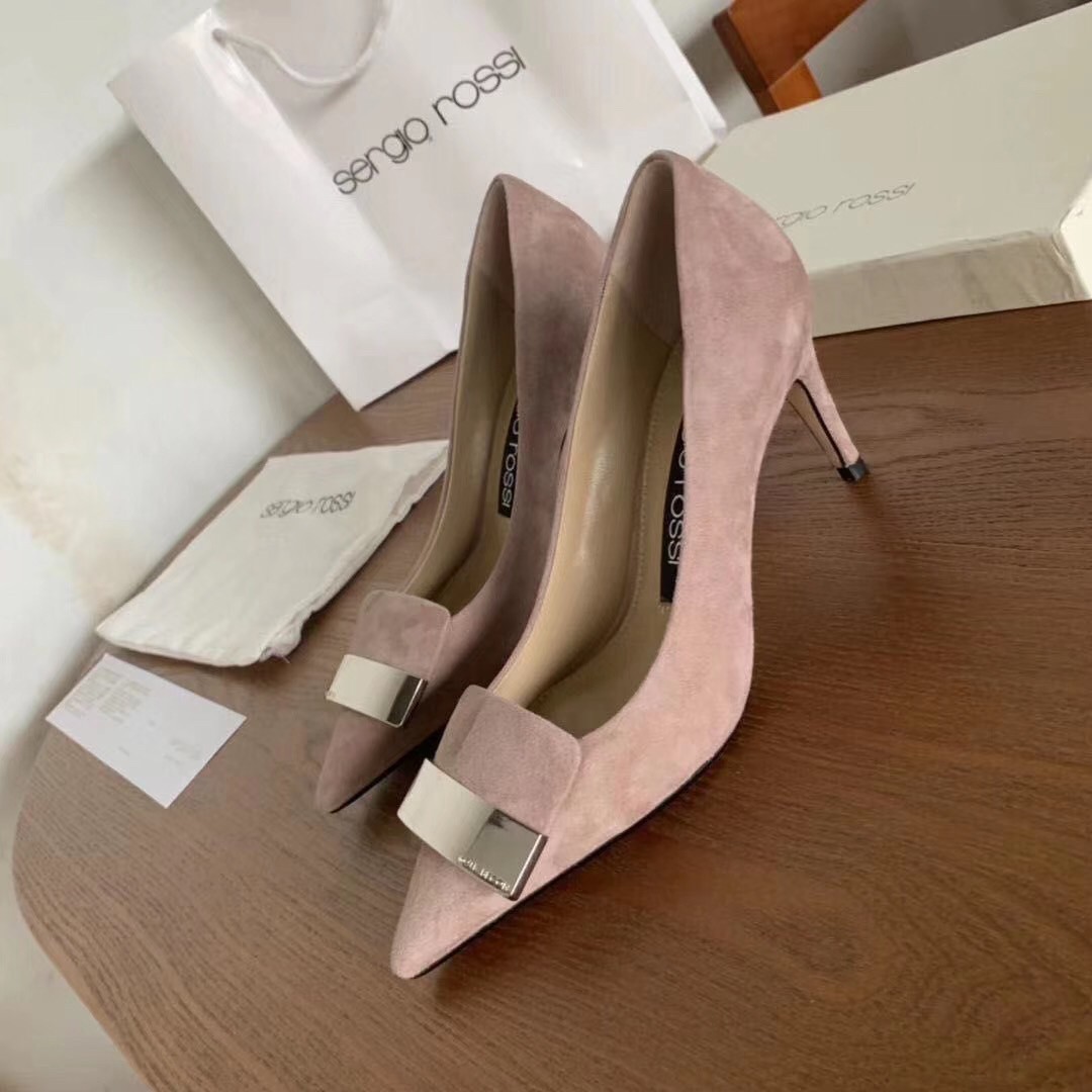 The sr1 pointed pump in suede leather with a midi heel exudes casual femininity. The precious silver-plated metal plaque completes the design with an unexpected touch of light for an authentic style statement.