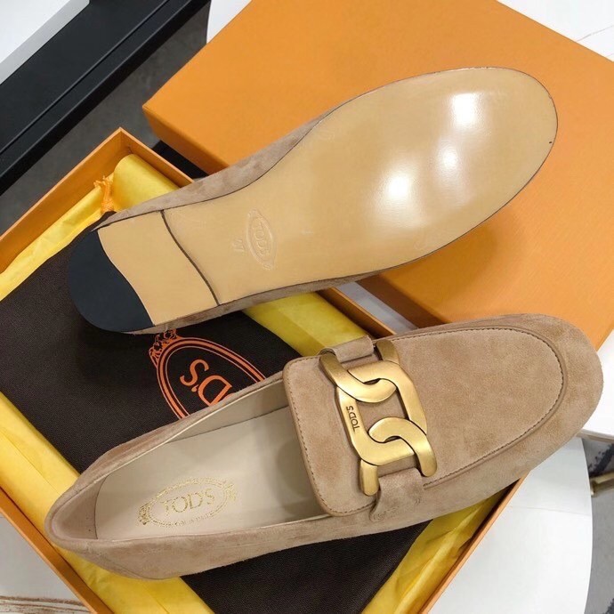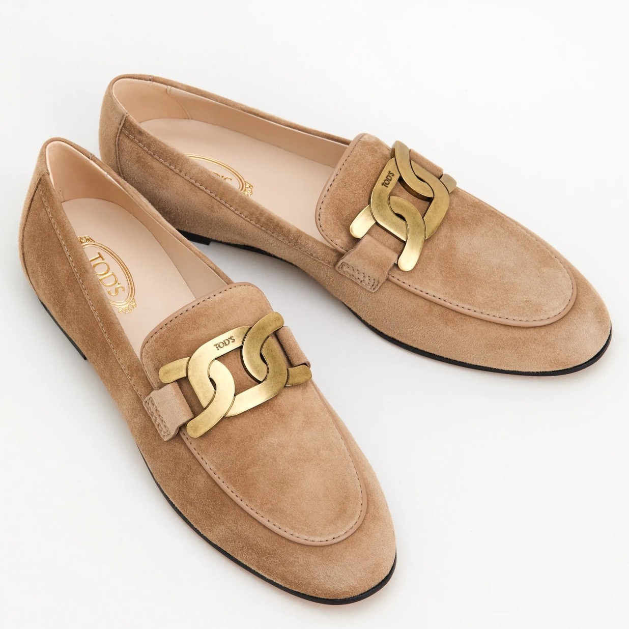 The season’s love of chain accents inspires the Kate loafers from Tod’s, which are adorned with antiqued golden links embossed with the house’s logo. They’re crafted from suede leather with soft leather insoles for comfort. Match their cappuccino shade with other neutrals for an insouciant yet sophisticated look.