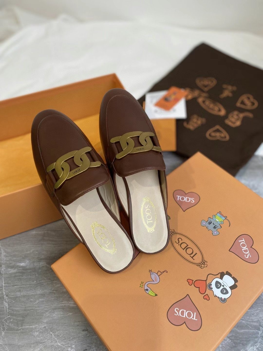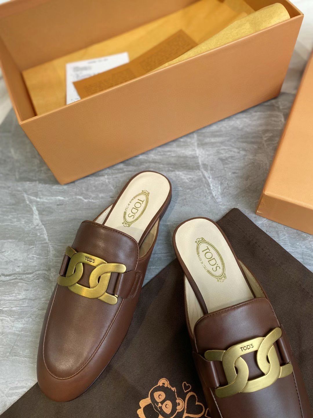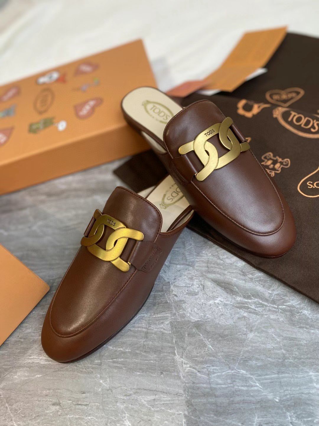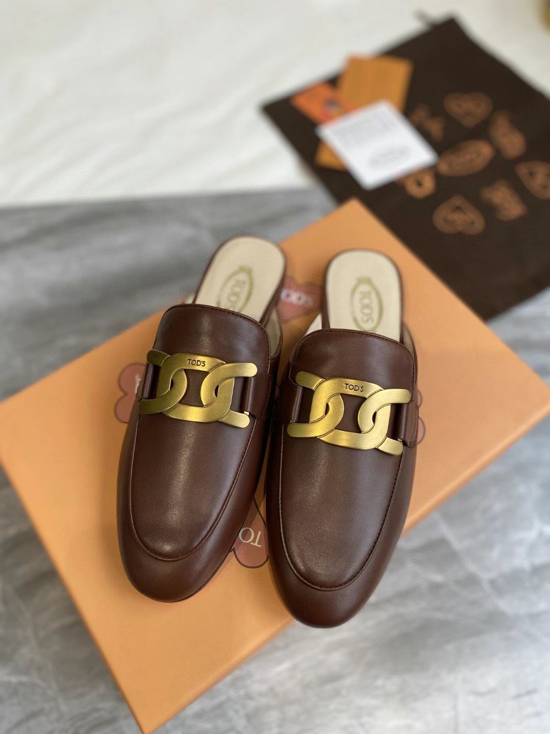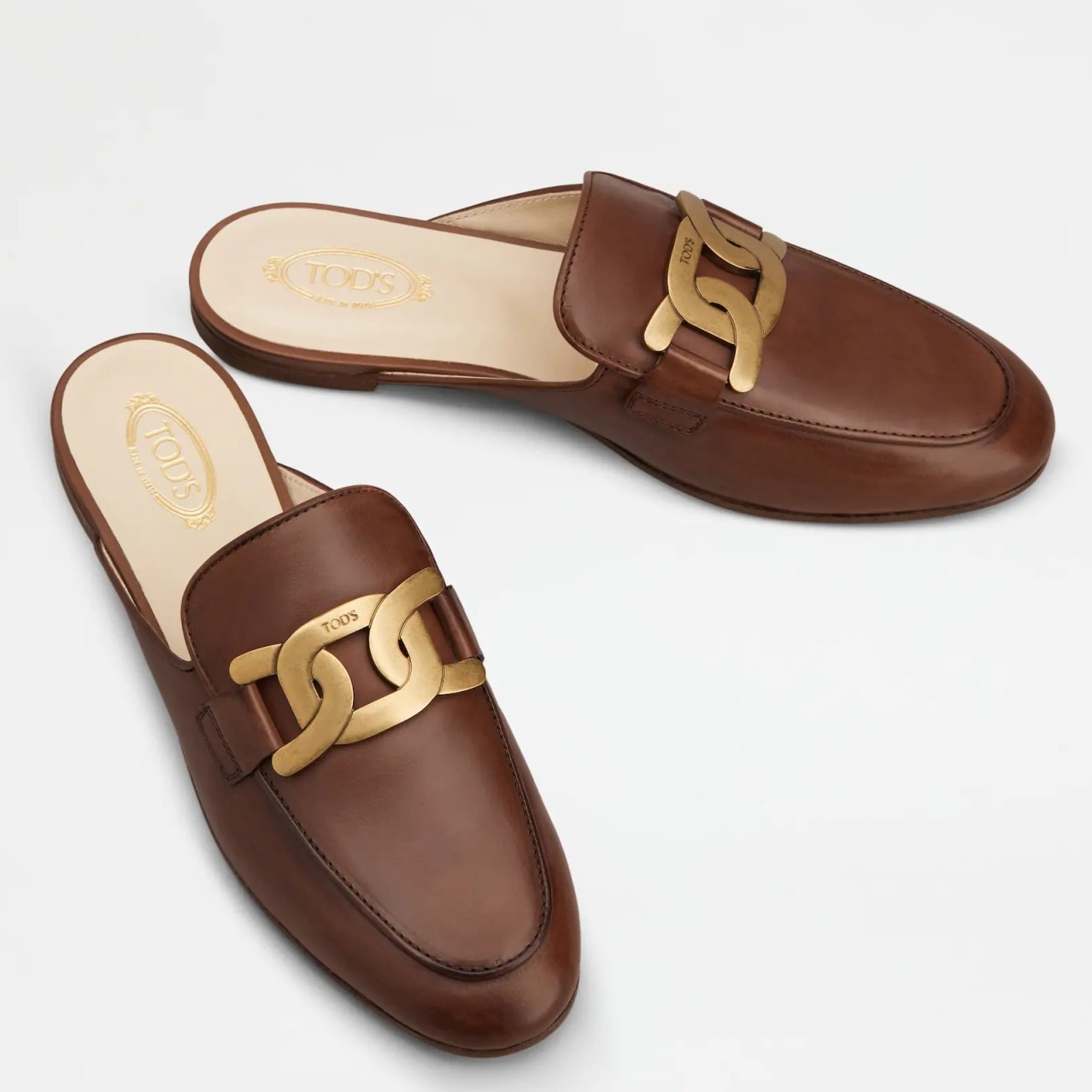Tod’s slippers have been crafted by artisans in Italy from supple smooth leather and topped with gold-tone hardware etched with house’s moniker. They have round toes and a slight heel for added lift. Wear them with cropped tailoring.