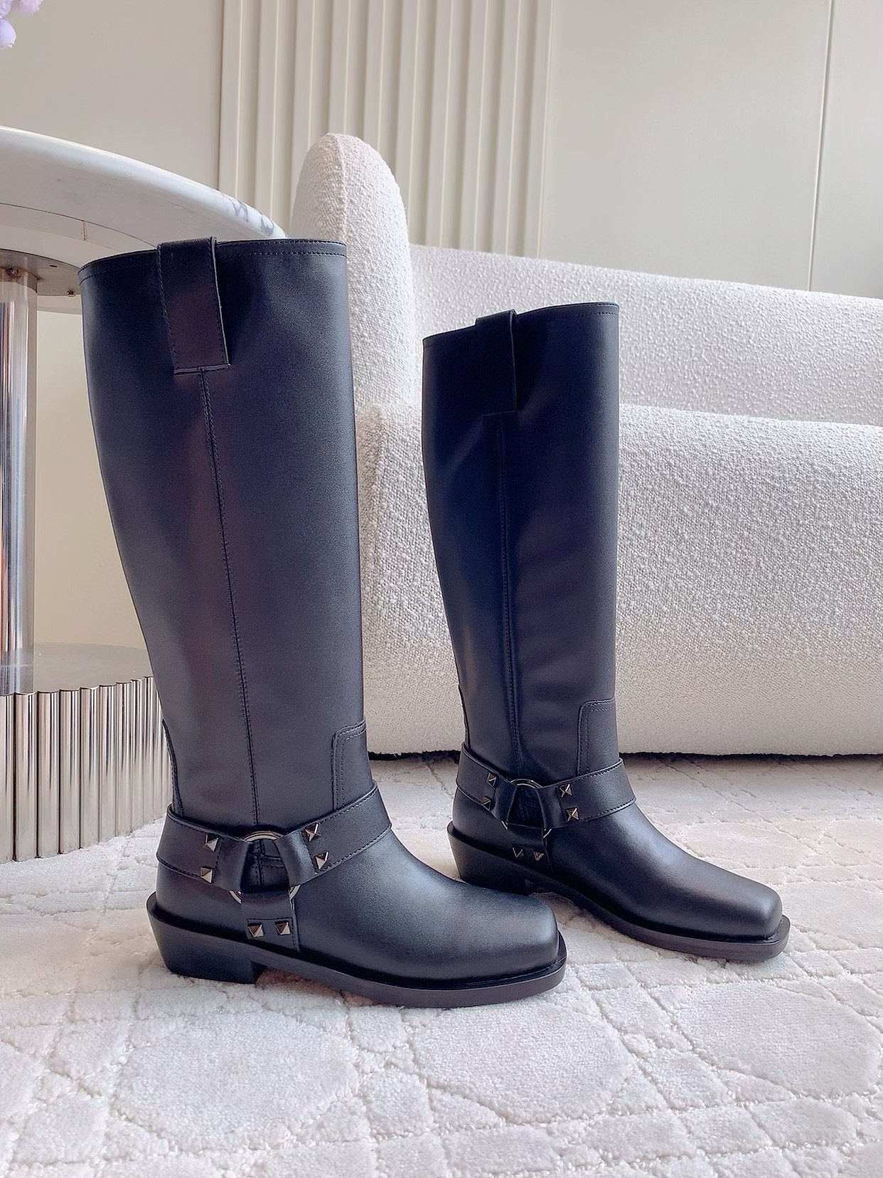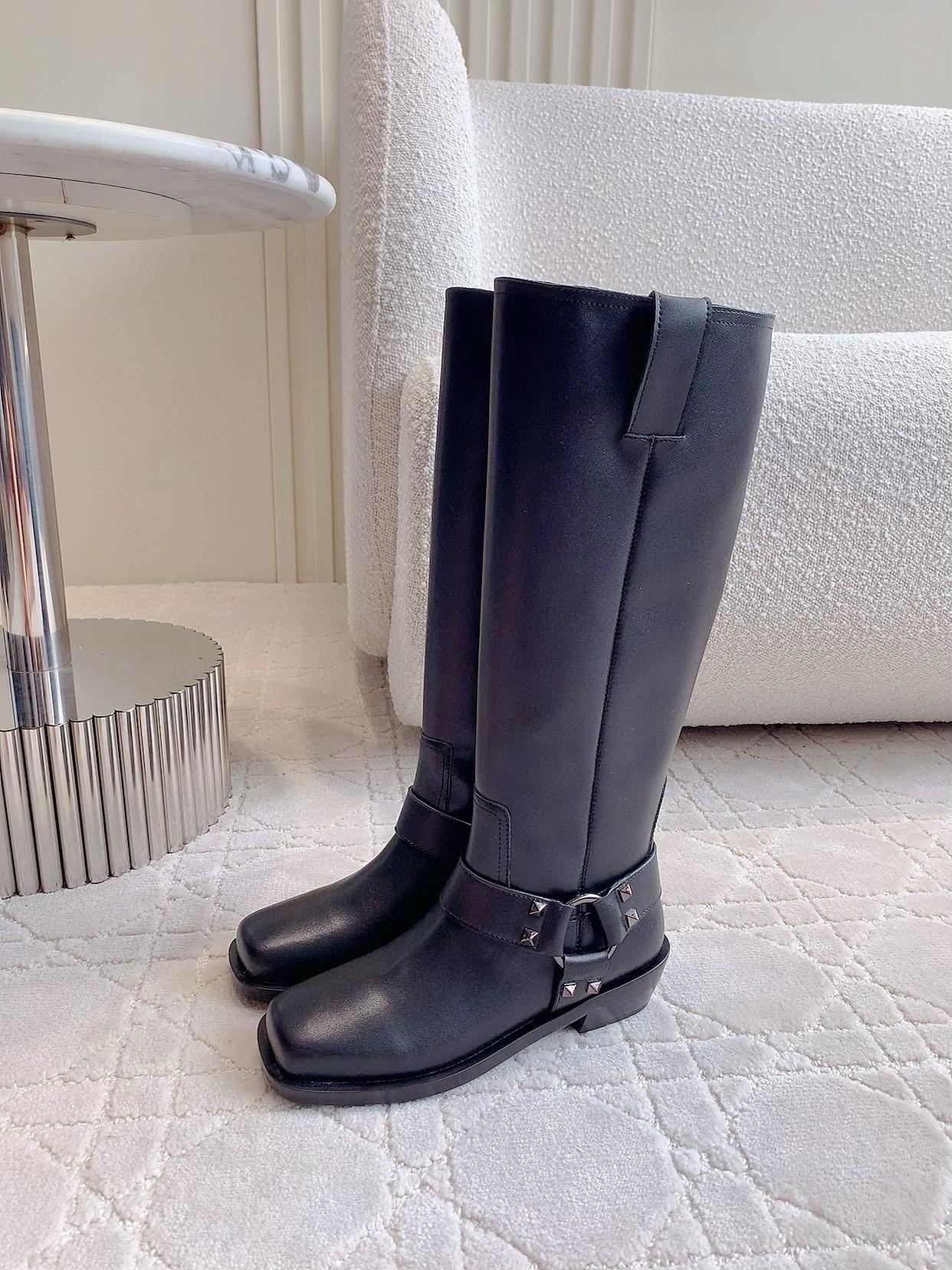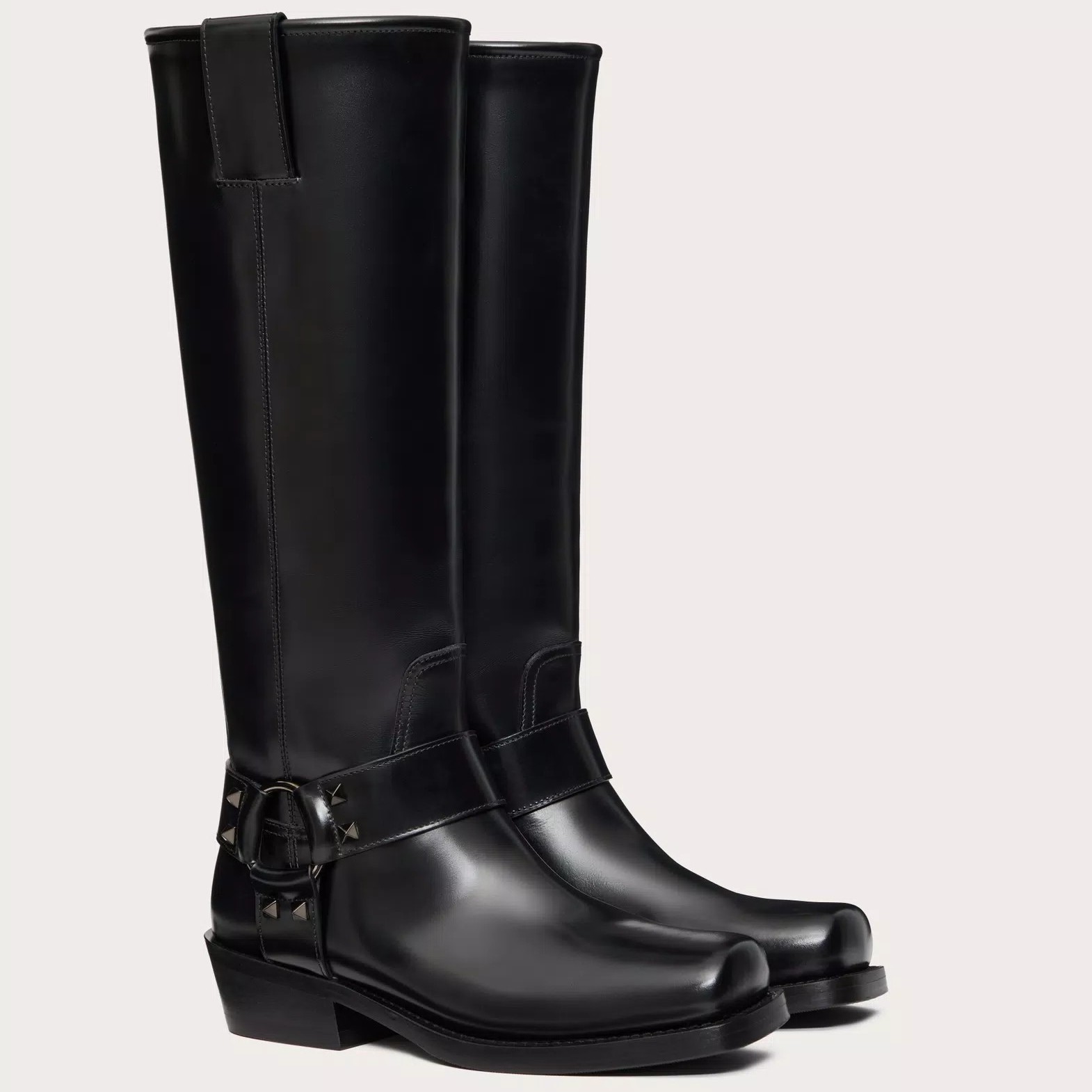 This season, the Italian house marries its signature couture know-how with an everyday wearability across beautifully-crafted shoes and handbags that strike a note of ease and practicality. Crafted from high-shine vernice leather, these knee-high biker boots feature tonal metal hardware and the Maison’s icon rockstud embellishments.