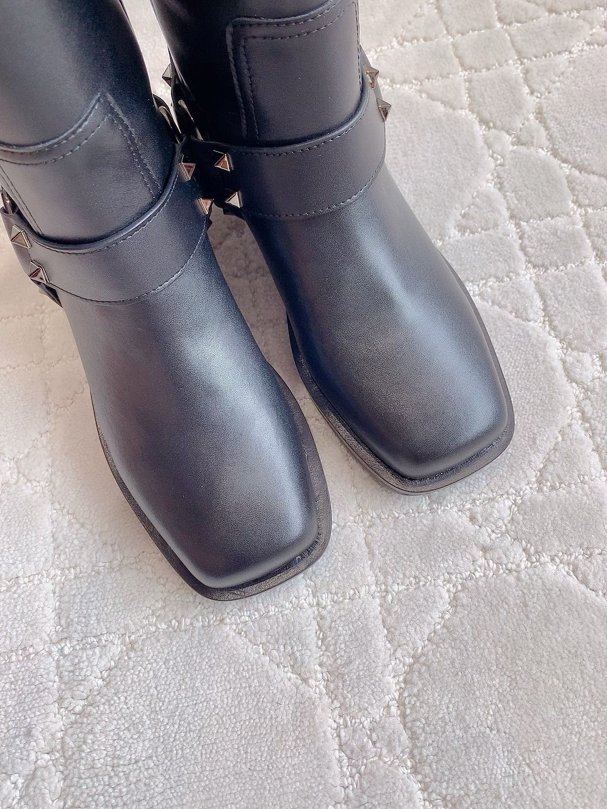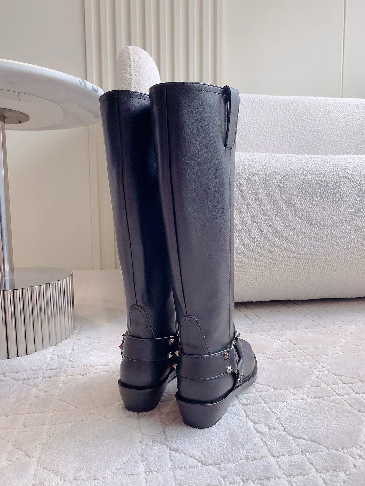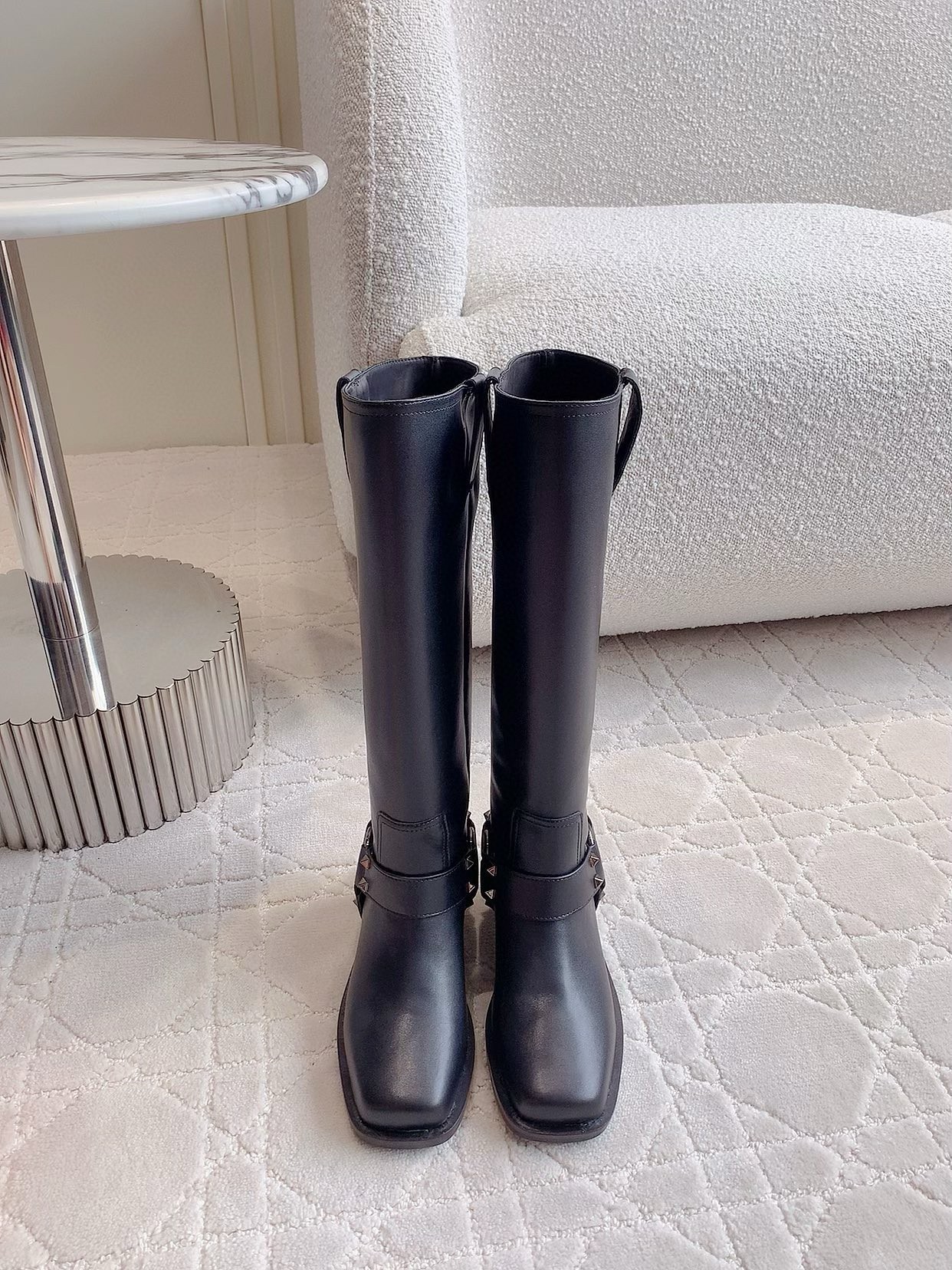 This season, the Italian house marries its signature couture know-how with an everyday wearability across beautifully-crafted shoes and handbags that strike a note of ease and practicality. Crafted from high-shine vernice leather, these knee-high biker boots feature tonal metal hardware and the Maison’s icon rockstud embellishments.