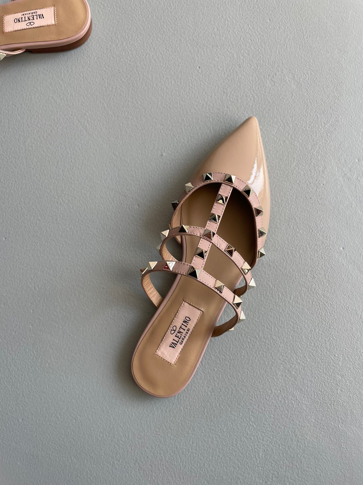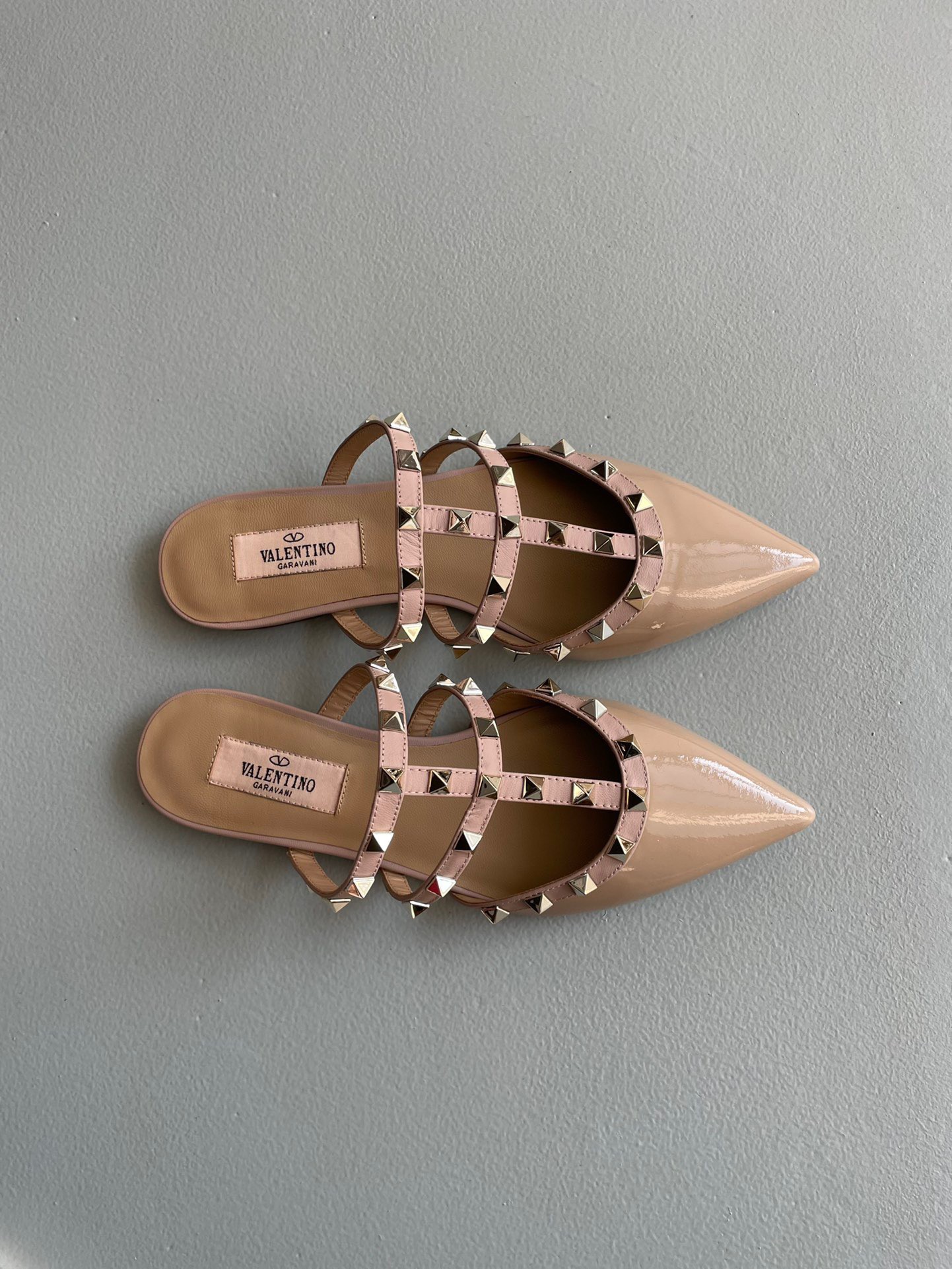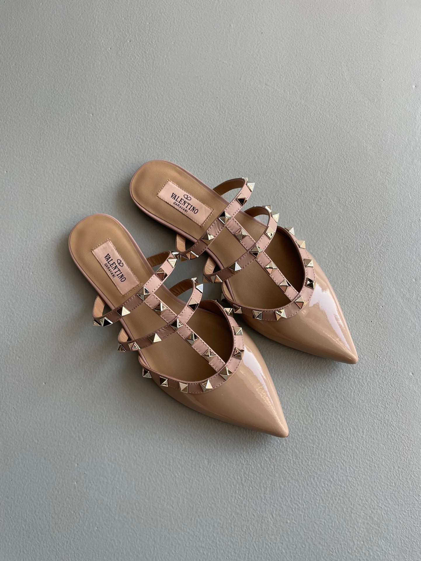 Valentino Rockstud Flat Mules In Poudre Patent Leather