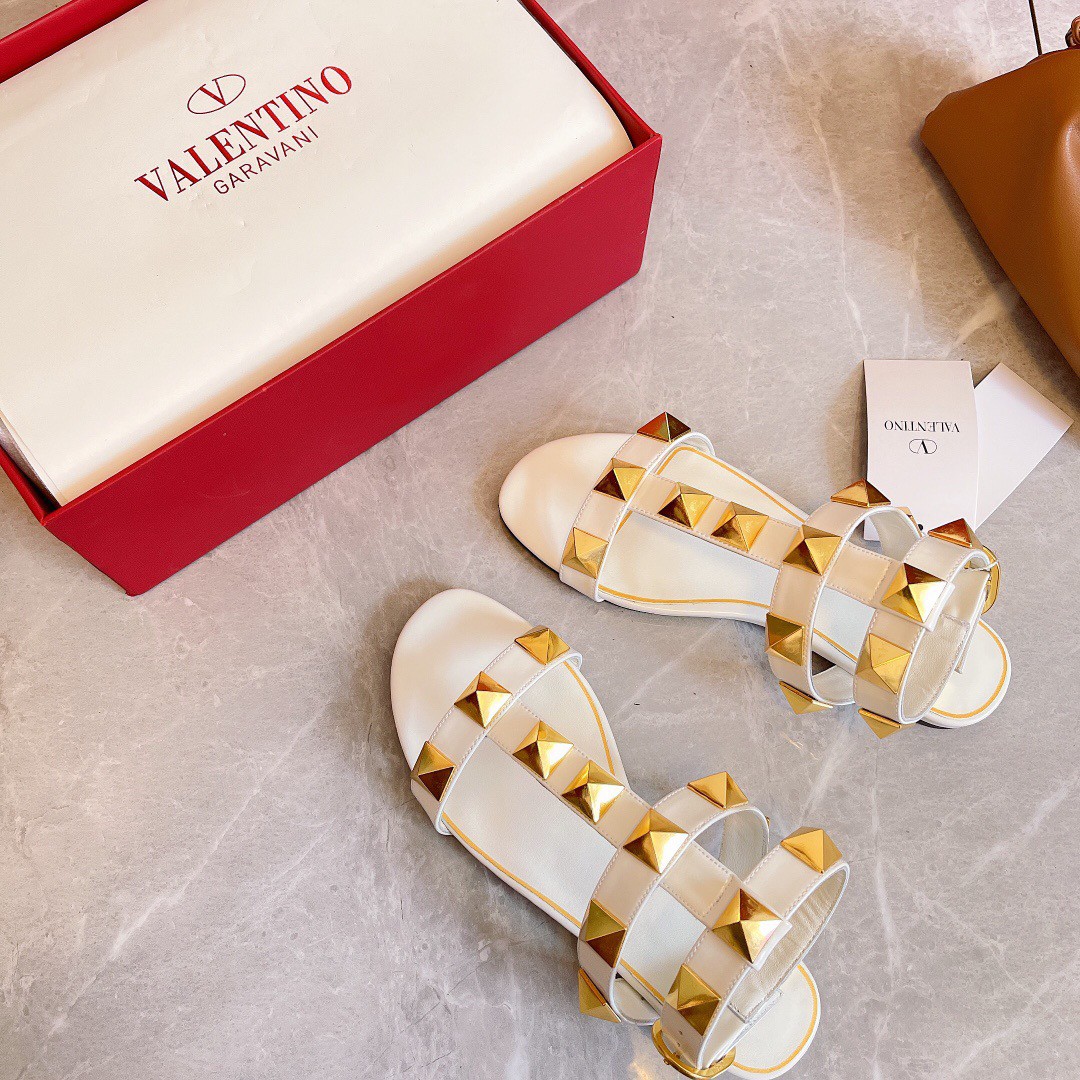 Valentino Roman Stud Flat Sandals In White Calfskin