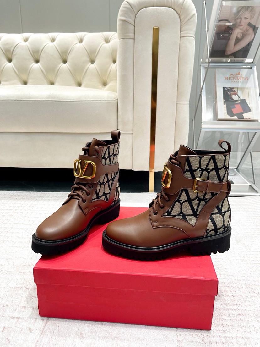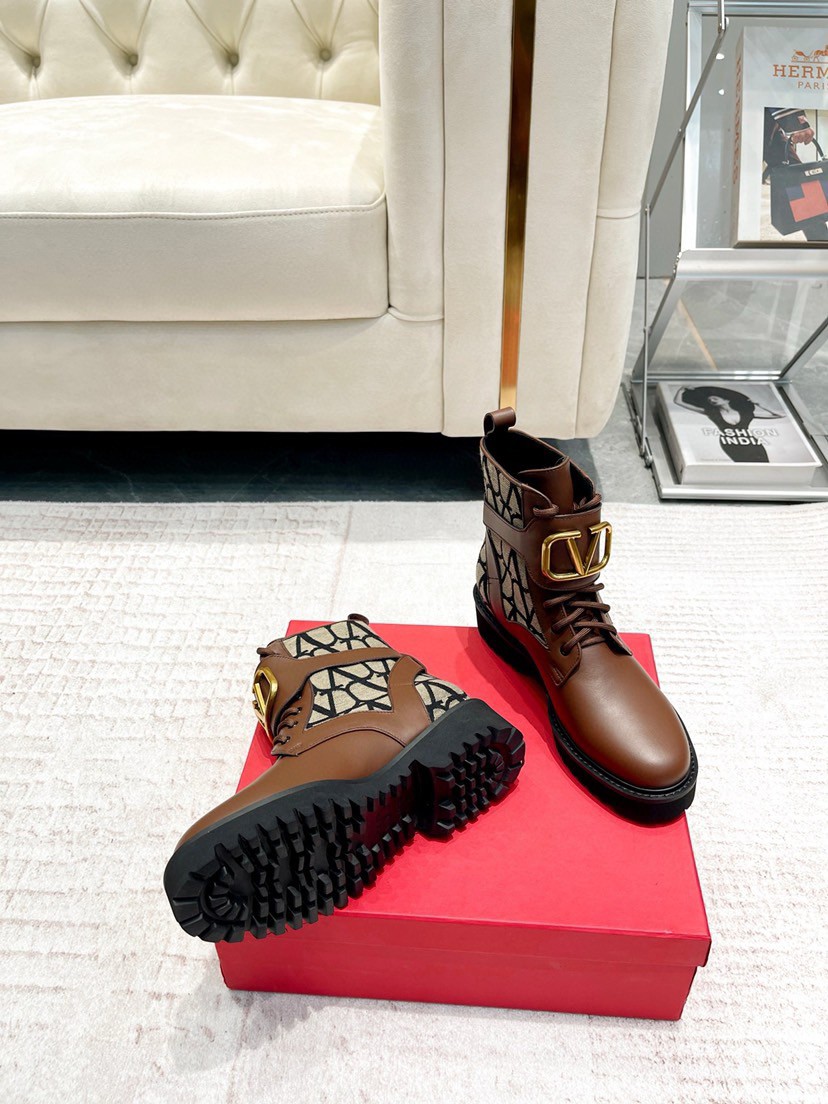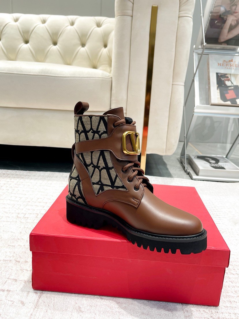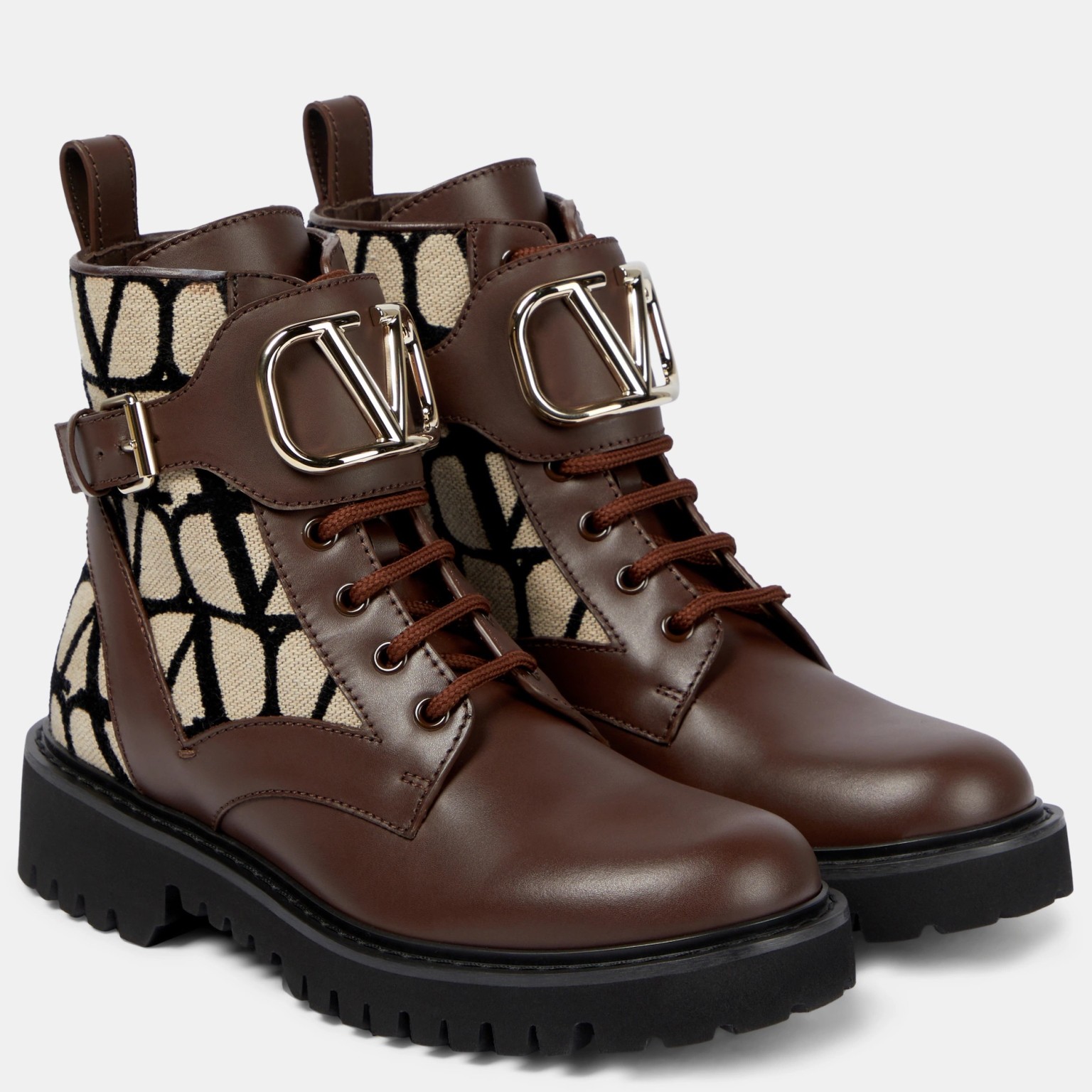 At once iconic and understated, Valentino Garavani’s VLogo carries the Maison’s legacy of elegance. The motif appears in gold-tone hardware on the smooth leather panels of these Toile Iconographe jacquard combat boots, resting on lugged soles.