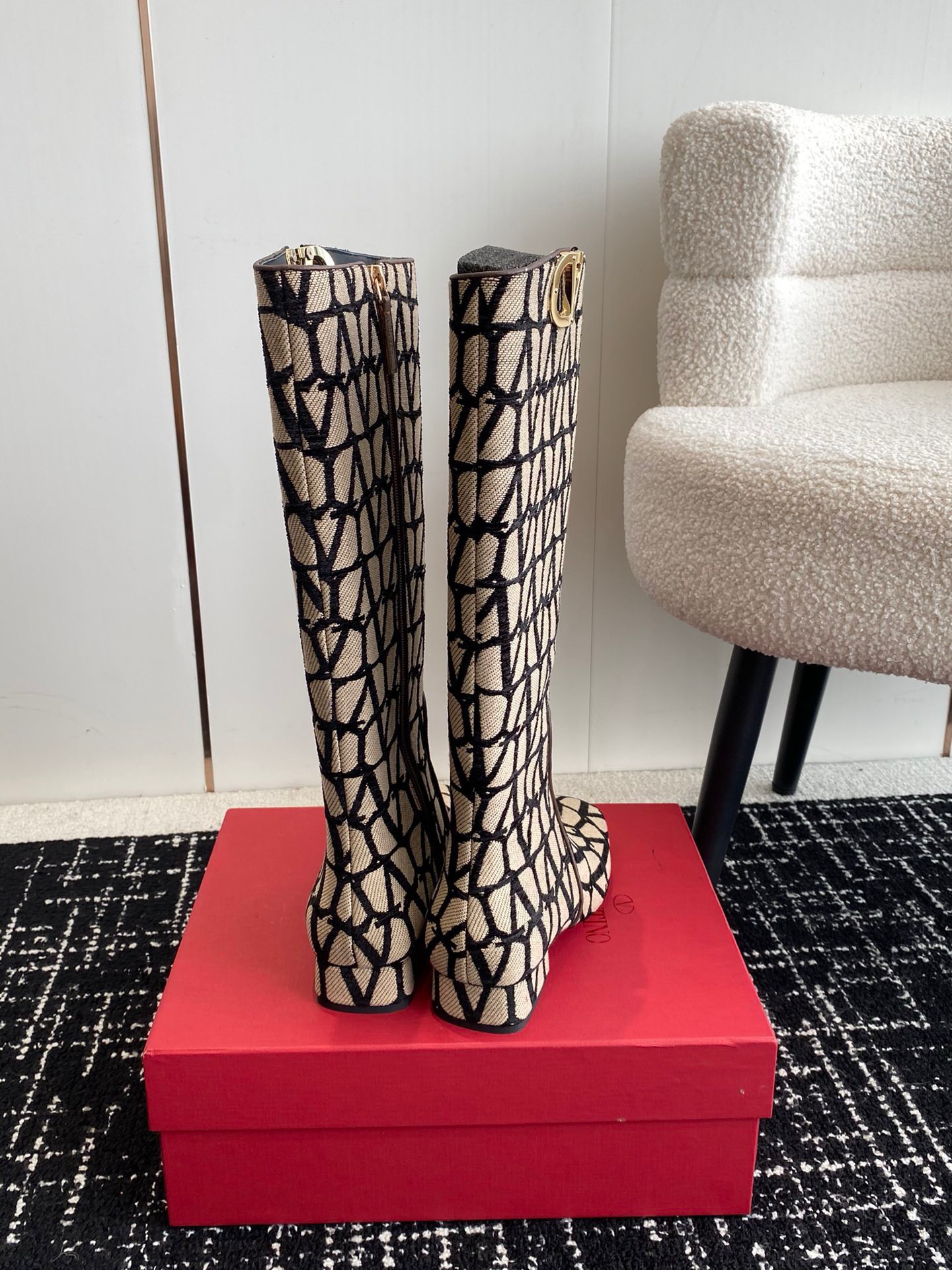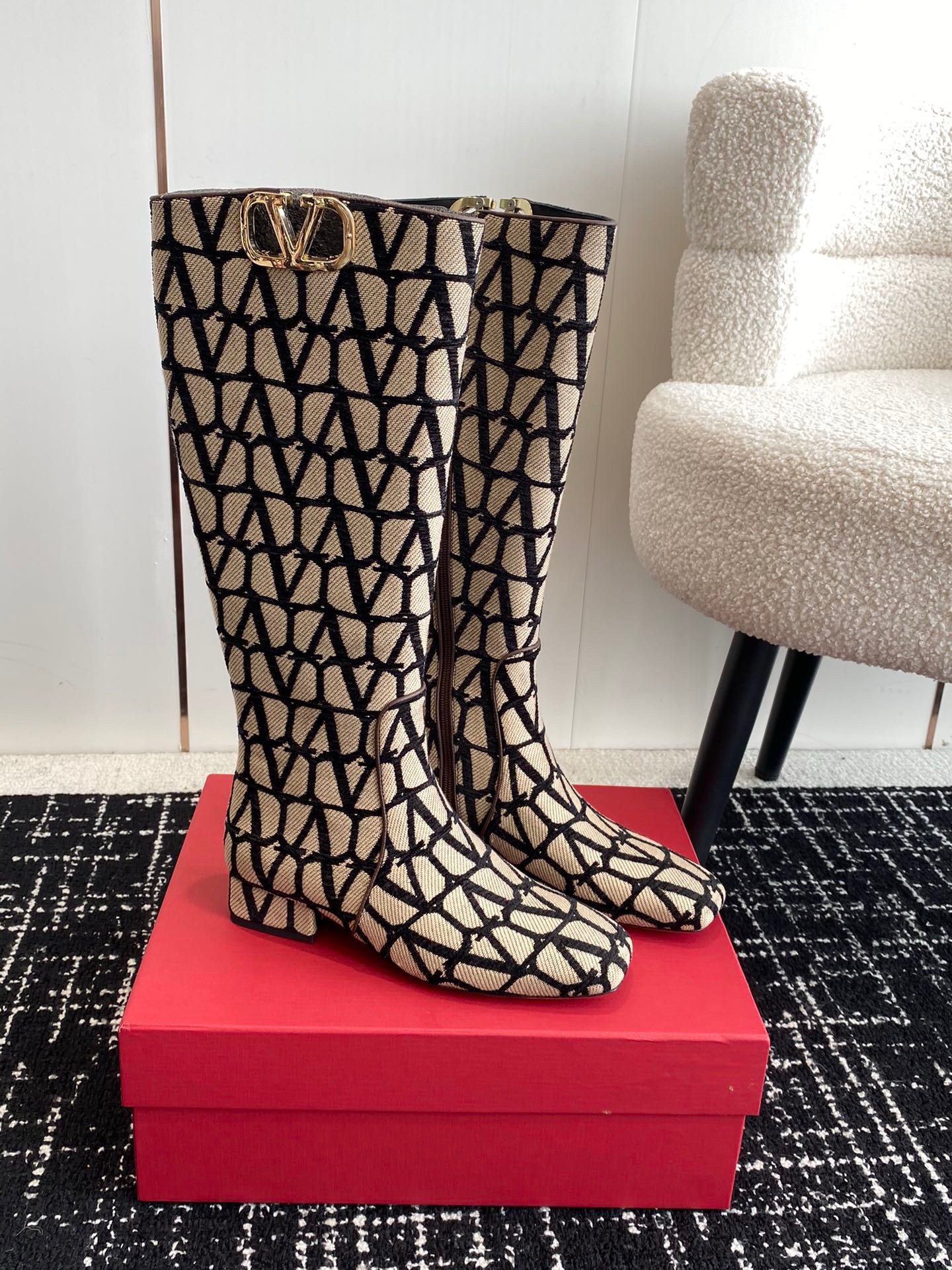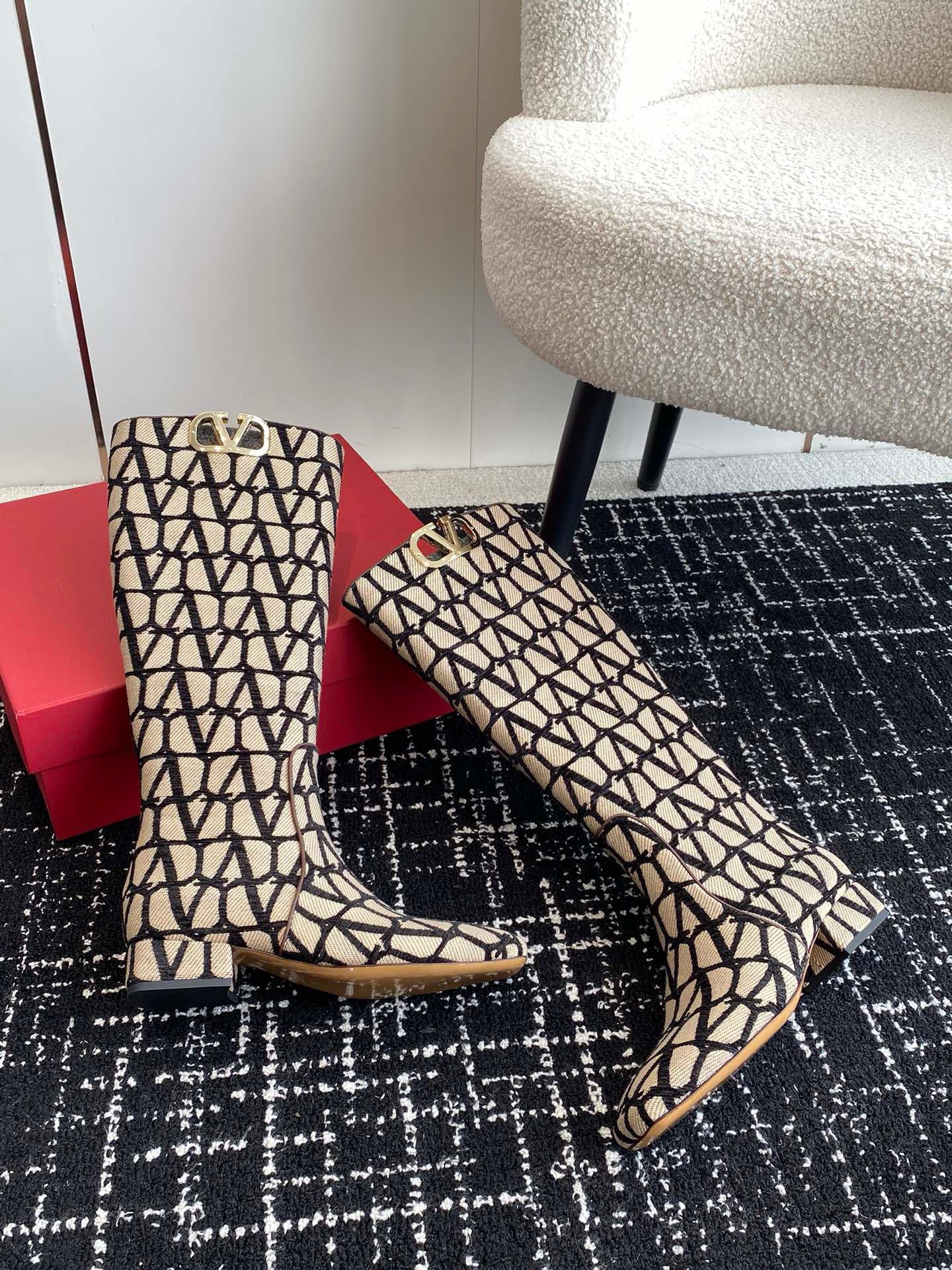 Valentino Garavani’s knee boots are covered in the brand’s signature ‘VLOGO’ – it’s jacquard woven throughout and featured as a plaque along the leather-trimmed cuffs. This pair is made from Toile Iconographe fabric and has square toes and comfortable 30mm block heels.