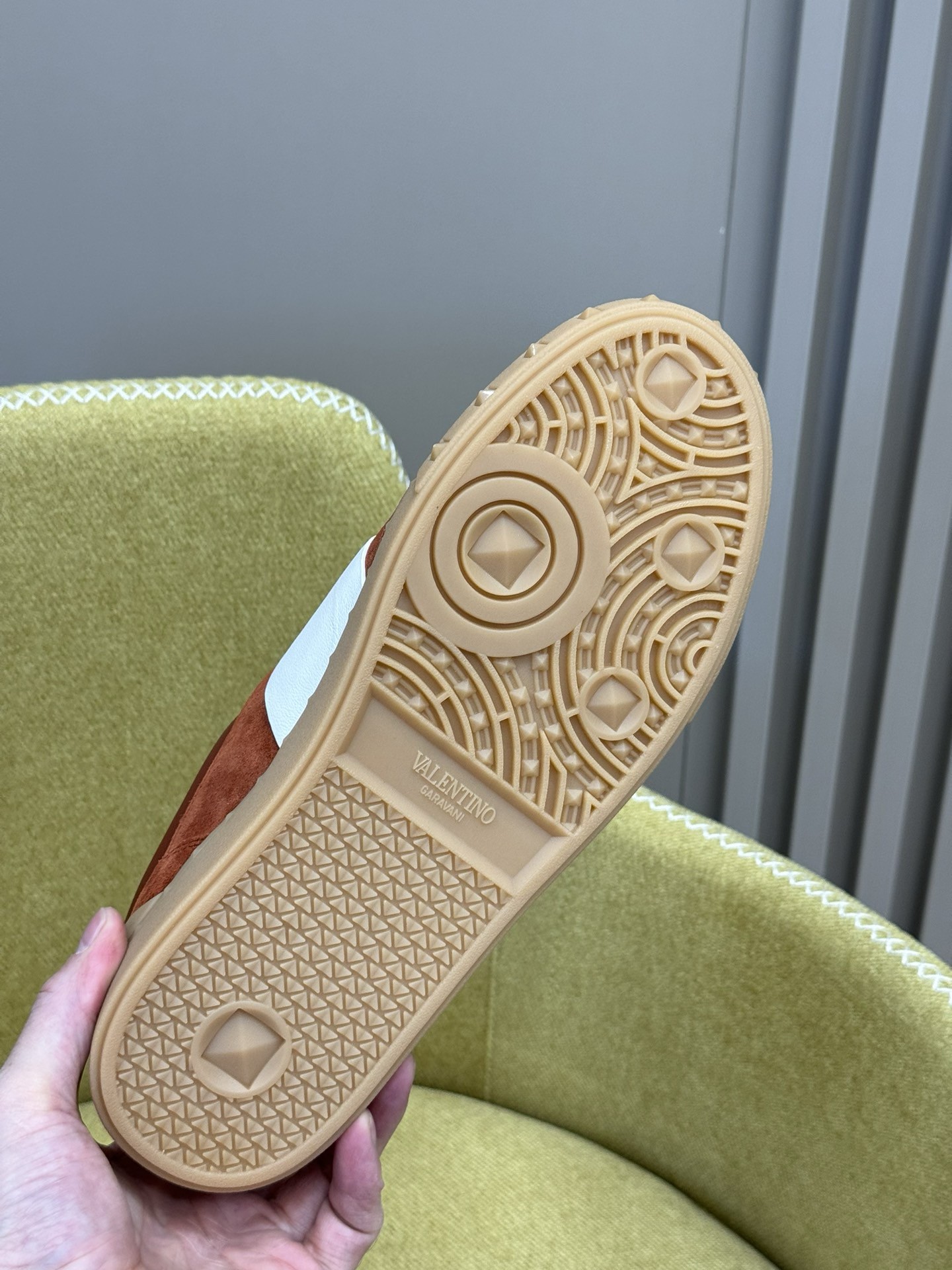 The iconic pigment that colours these low-top sneakers, drawing attention to their suede leather craftsmanship and neat-as-a-pin topstitching. Valentino Garavani further enhances their quality by incorporating feature side panels embellished with shimmering foil-stamped logos, serving as a hallmark of excellence.