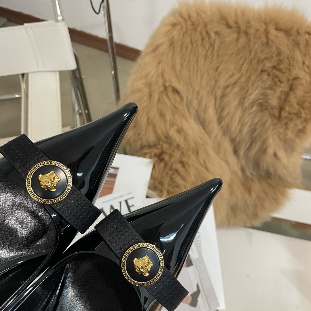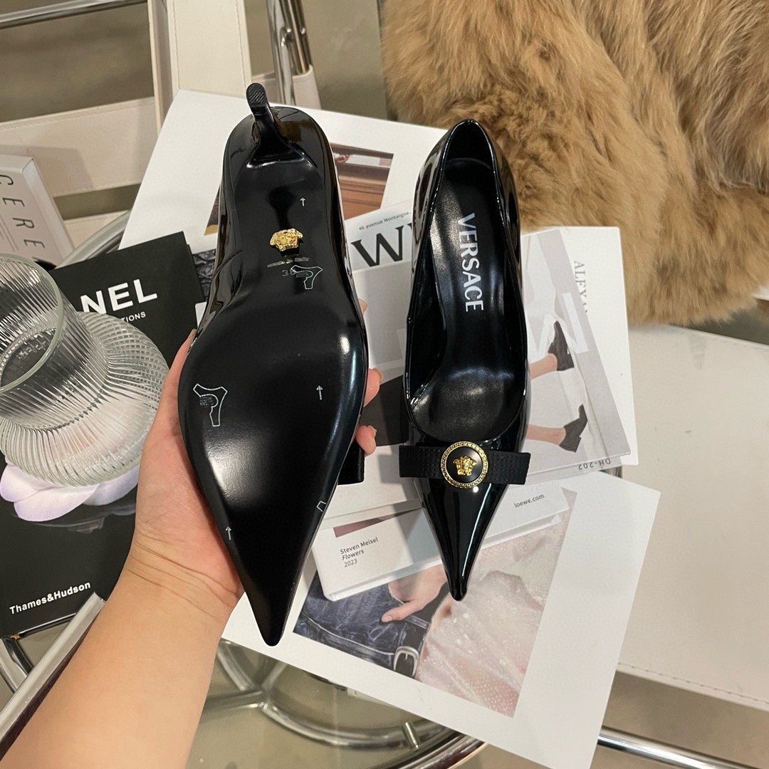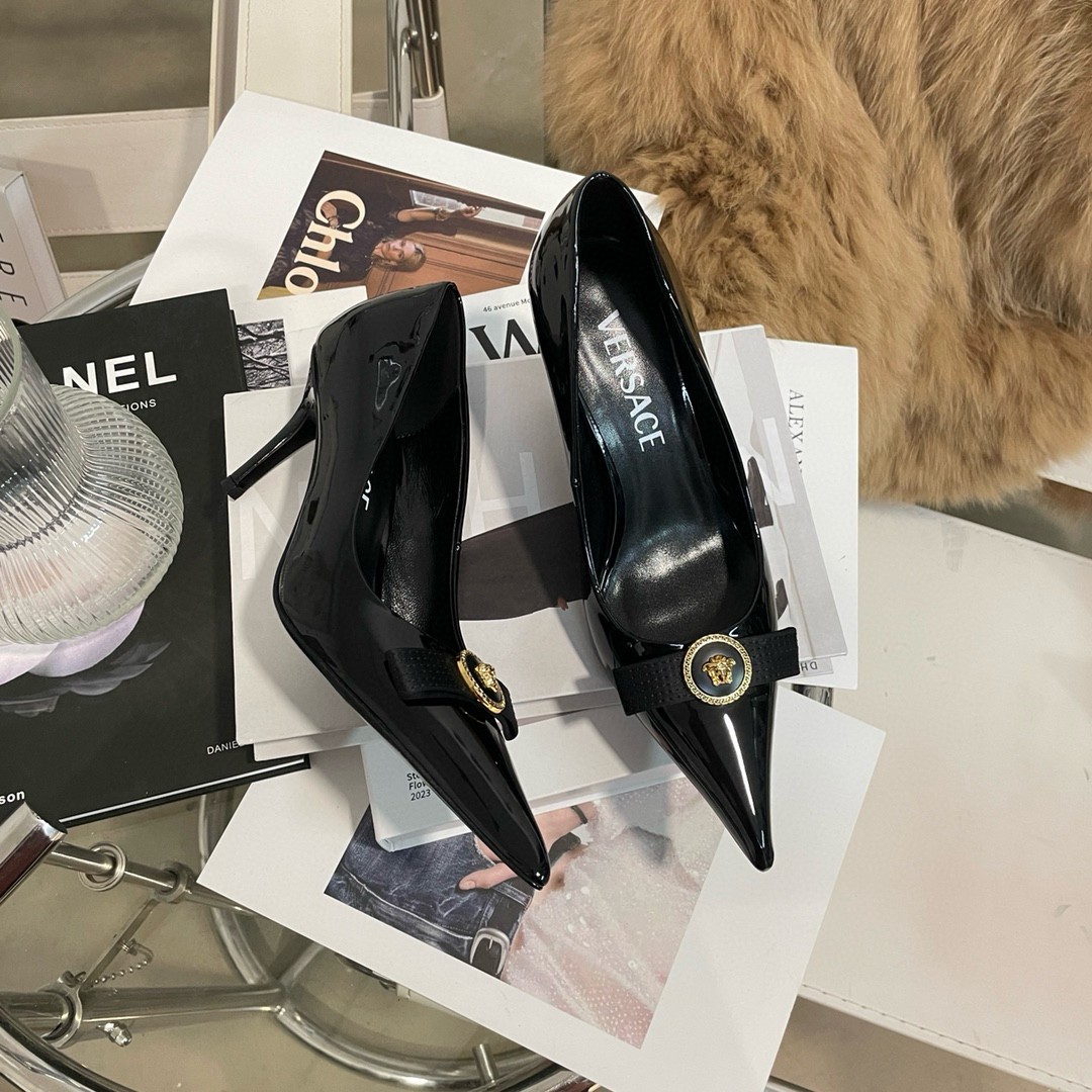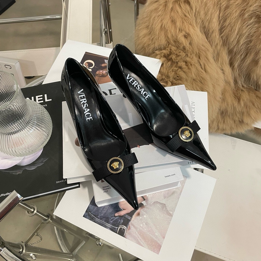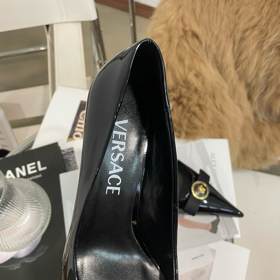These Versace point-toe pumps are decorated with the Nastro Gianni bow and Medusa plaque hardware at the front. They’re sculpted from glossy leather and set atop towering stiletto heels.
