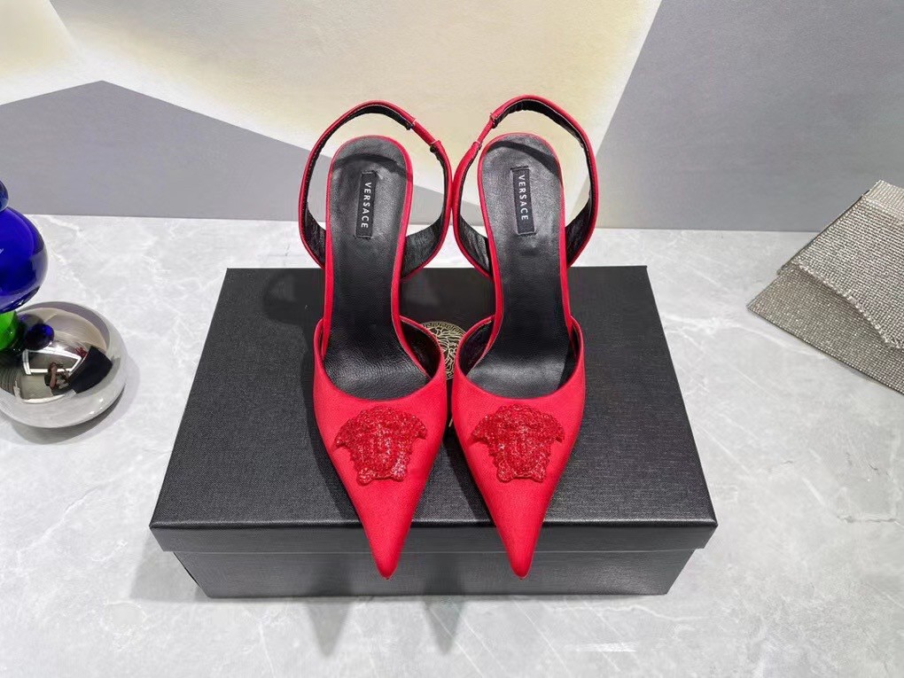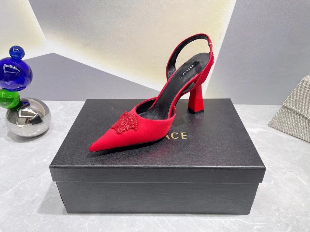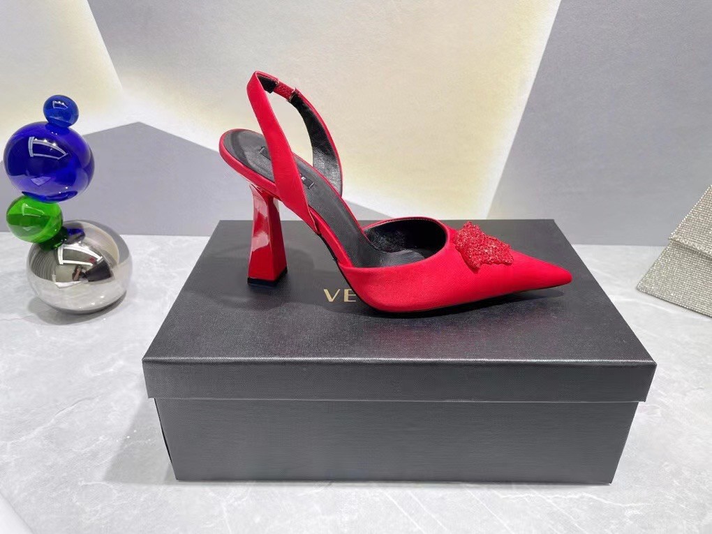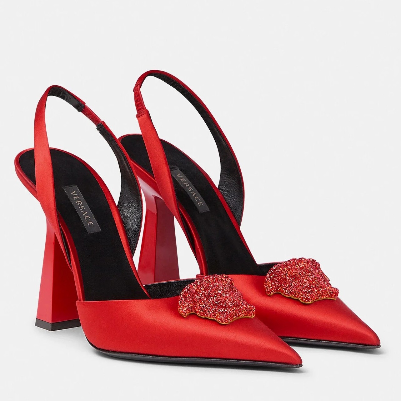 Effortlessly elegant, these slingbacks are crafted from smooth satin. The sleek pointed toe silhouette is adorned with a fully crystal-encrusted Medusa plaque – the iconic décor found on the doors of the brand’s first headquarters in Milan.