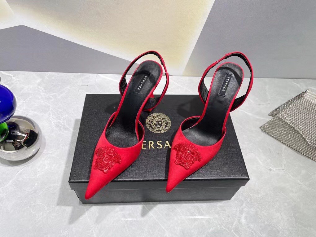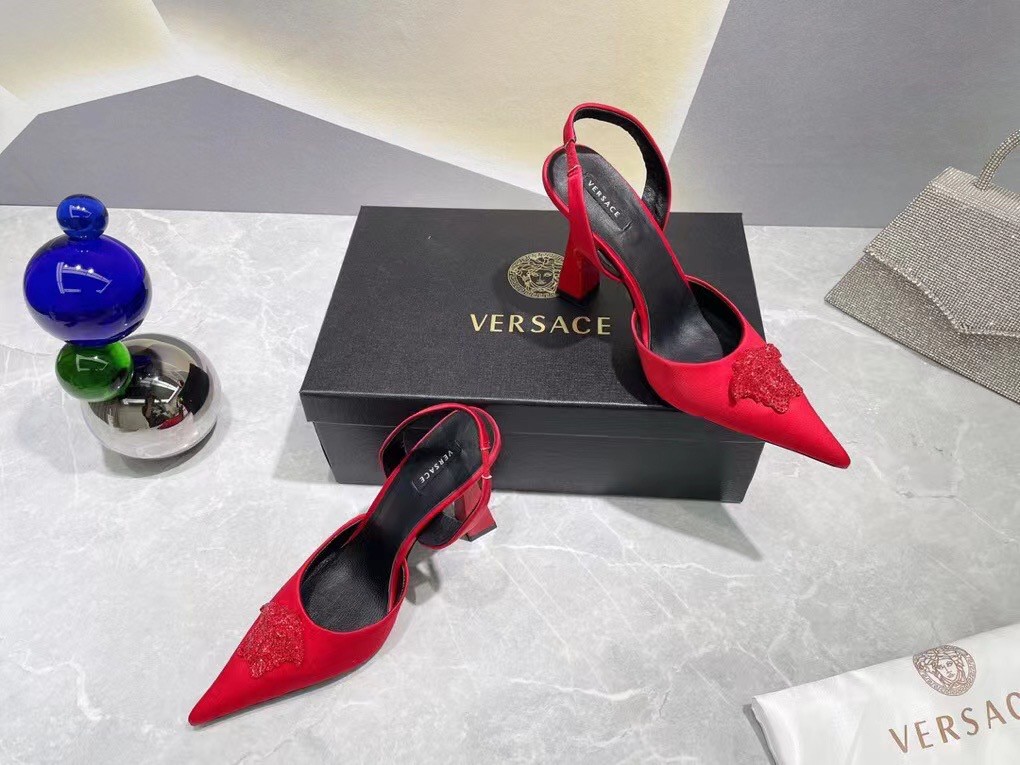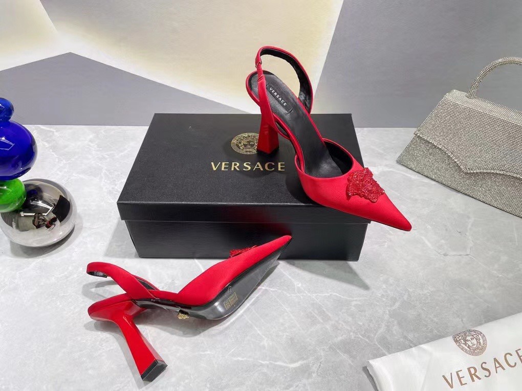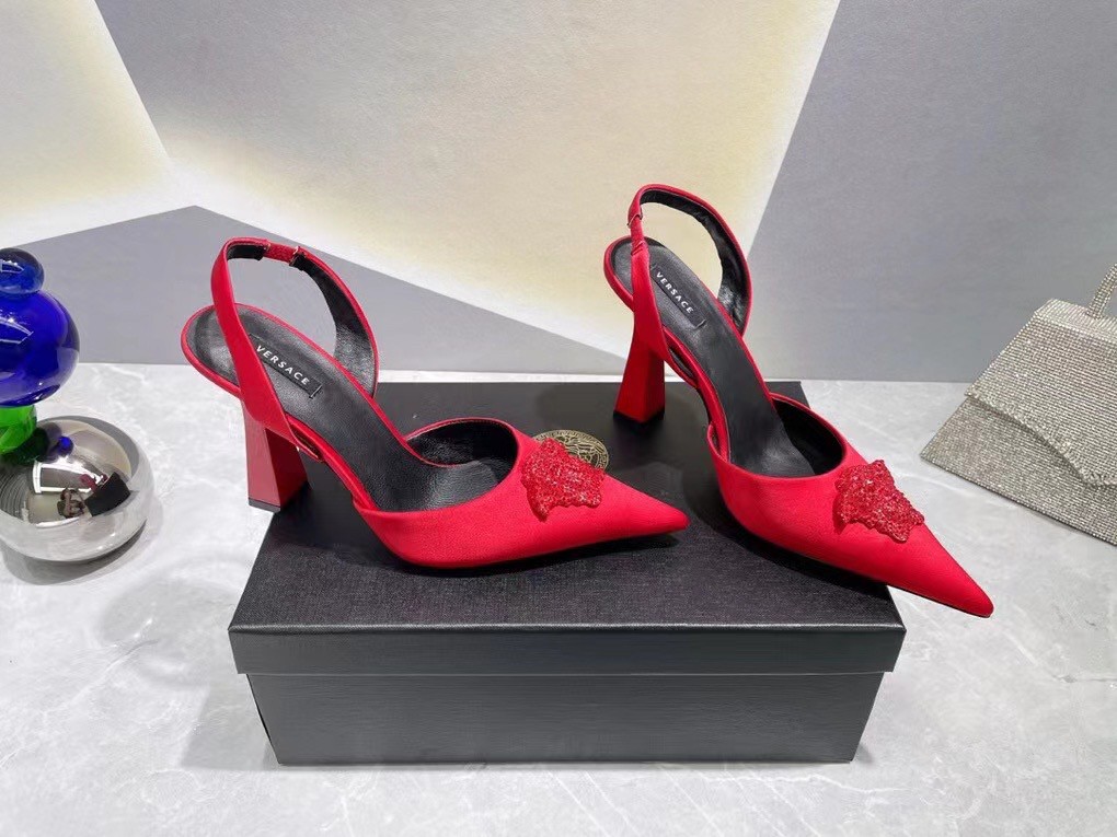 Effortlessly elegant, these slingbacks are crafted from smooth satin. The sleek pointed toe silhouette is adorned with a fully crystal-encrusted Medusa plaque – the iconic décor found on the doors of the brand’s first headquarters in Milan.