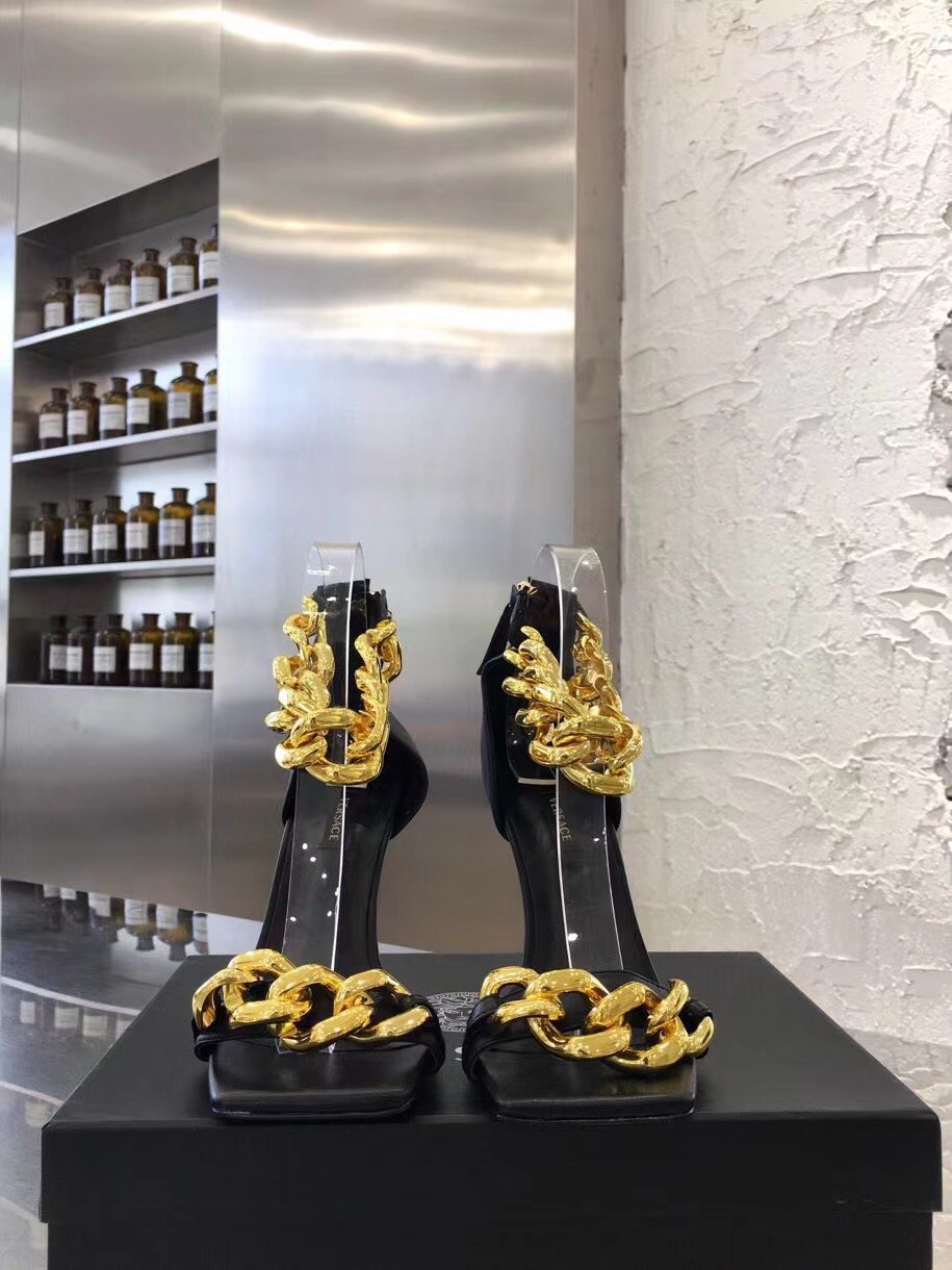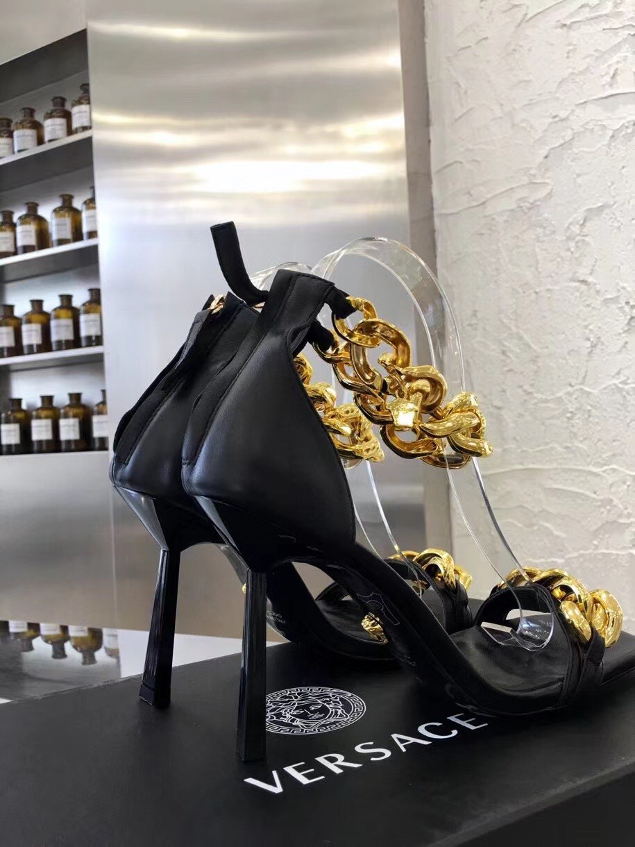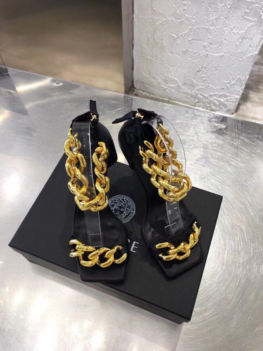 Stand head and shoulder above the rest with these black and golden Medusa Chain sandals from Versace. Made from soft nappa leather, they suspend eponymous pendants at the curb-chain ankle straps, and perch atop towering flared heels. Note the zipped heel counters for easy on-off wear.