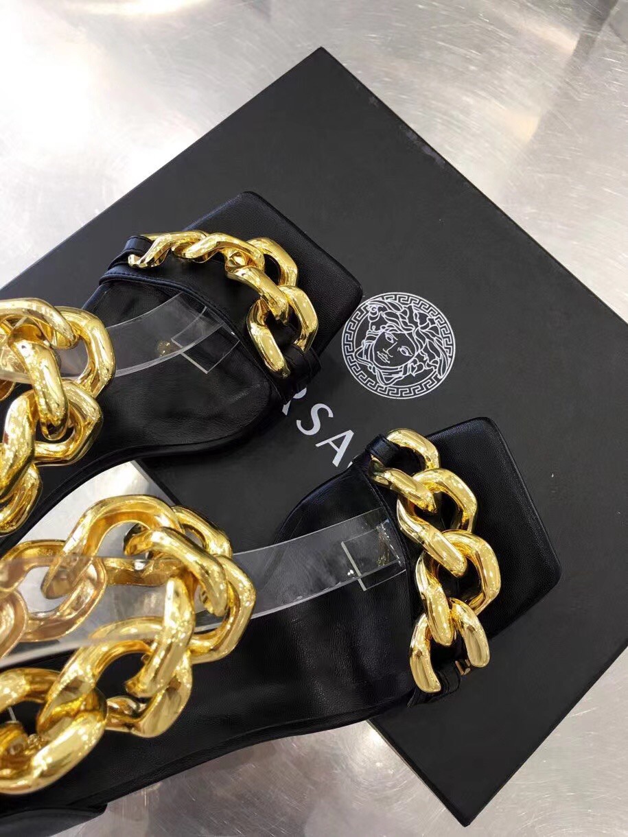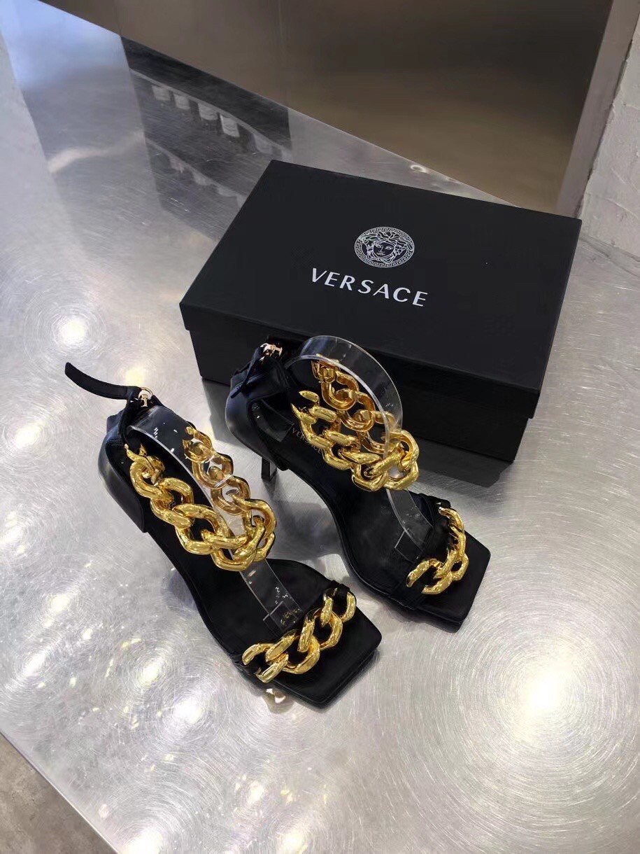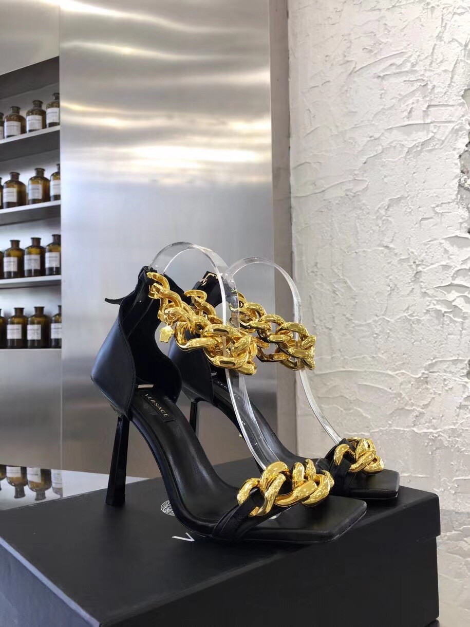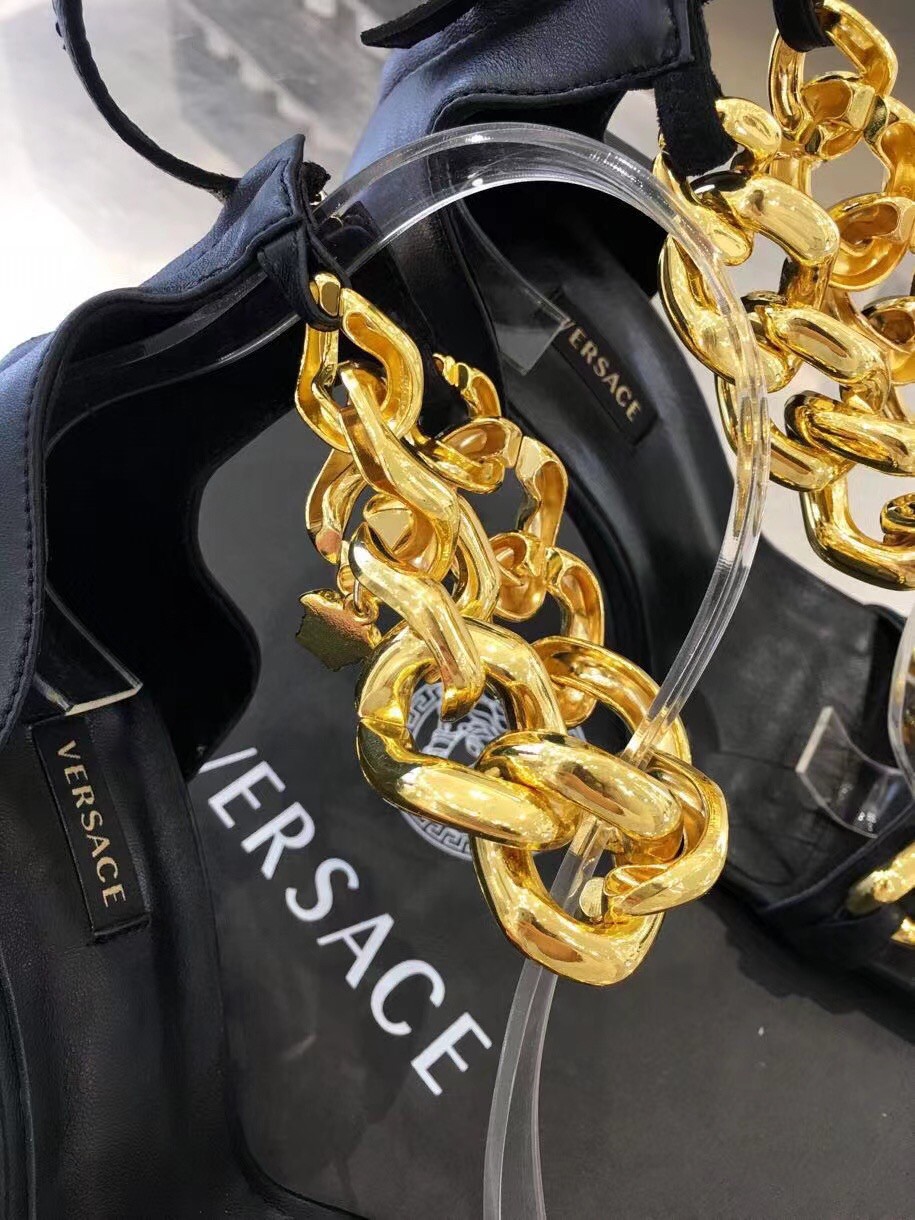 Stand head and shoulder above the rest with these black and golden Medusa Chain sandals from Versace. Made from soft nappa leather, they suspend eponymous pendants at the curb-chain ankle straps, and perch atop towering flared heels. Note the zipped heel counters for easy on-off wear.