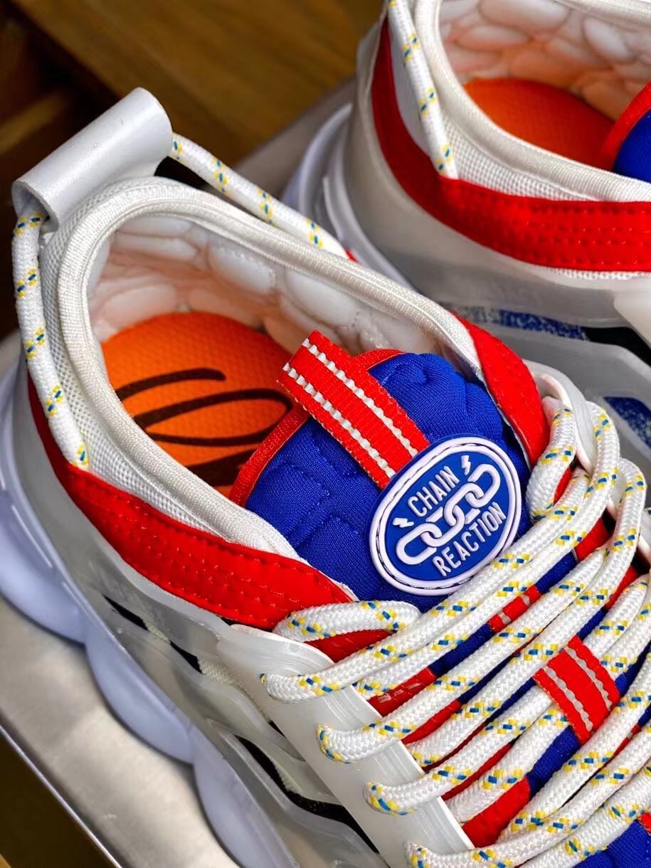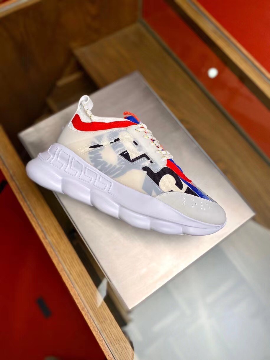 These white Versace ‘Chain Reaction’ sneakers feature a printed neoprene upper, front and back pull loops, white rope laces, suede and leather details, reinforced panels, a stacked white rubber sole and a rear embossed Medusa head. The shape of the sole on these Versace ‘Chain Reaction’ sneakers reminds us of grandmama’s antique rocking horse. We can visualise you wearing yours when off your rocker in Richmond.