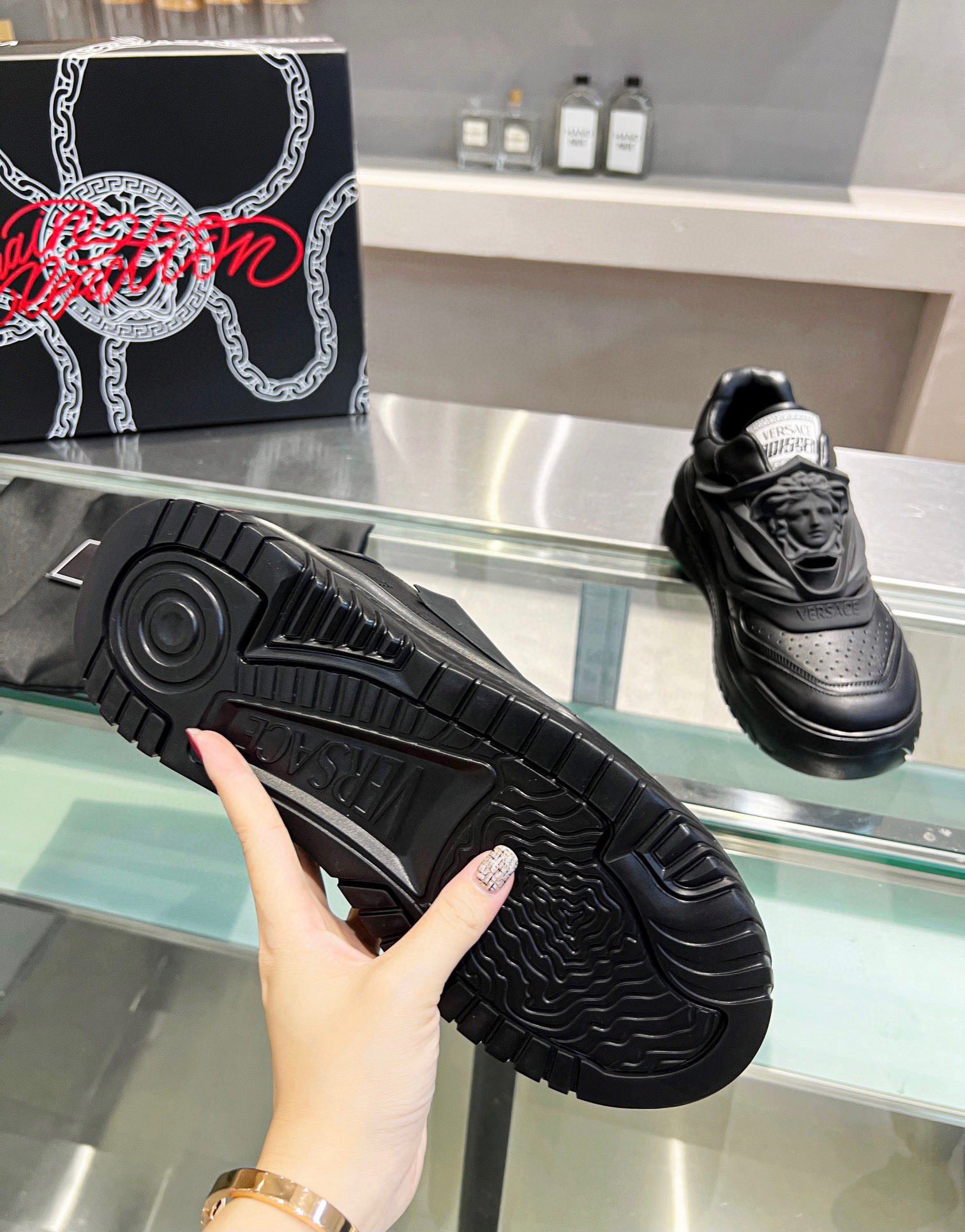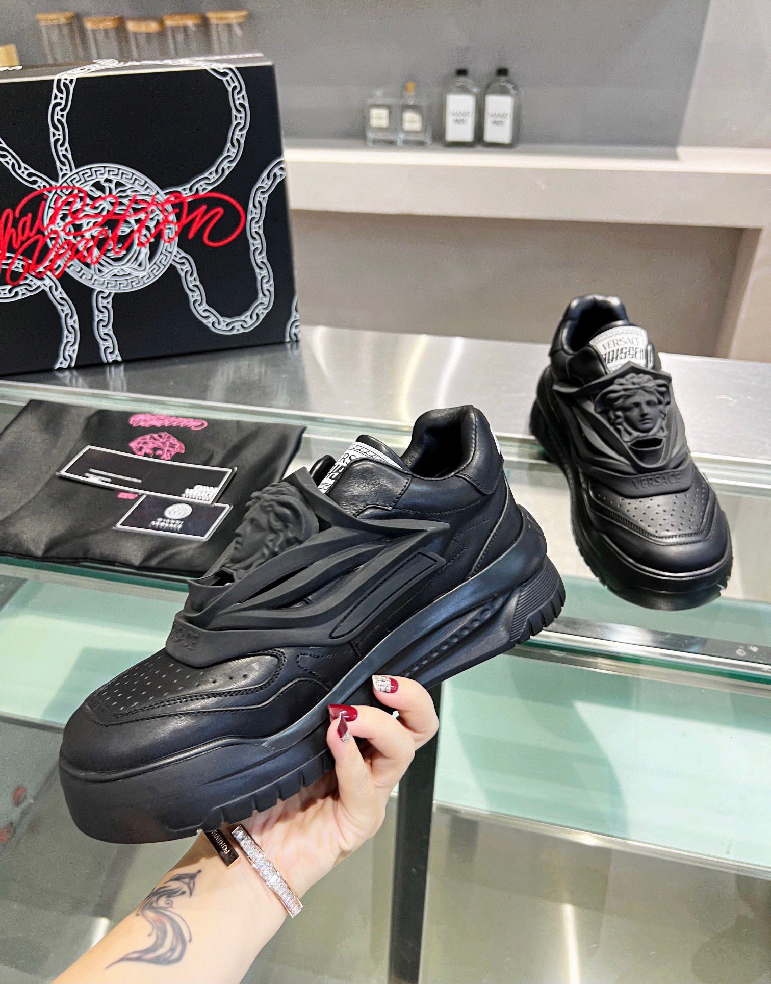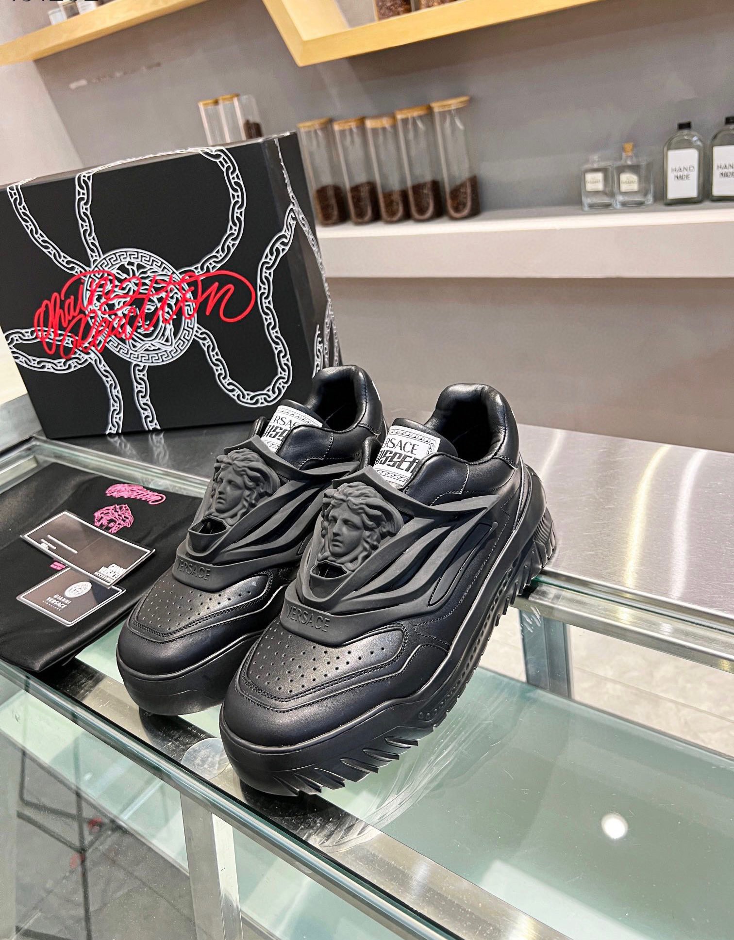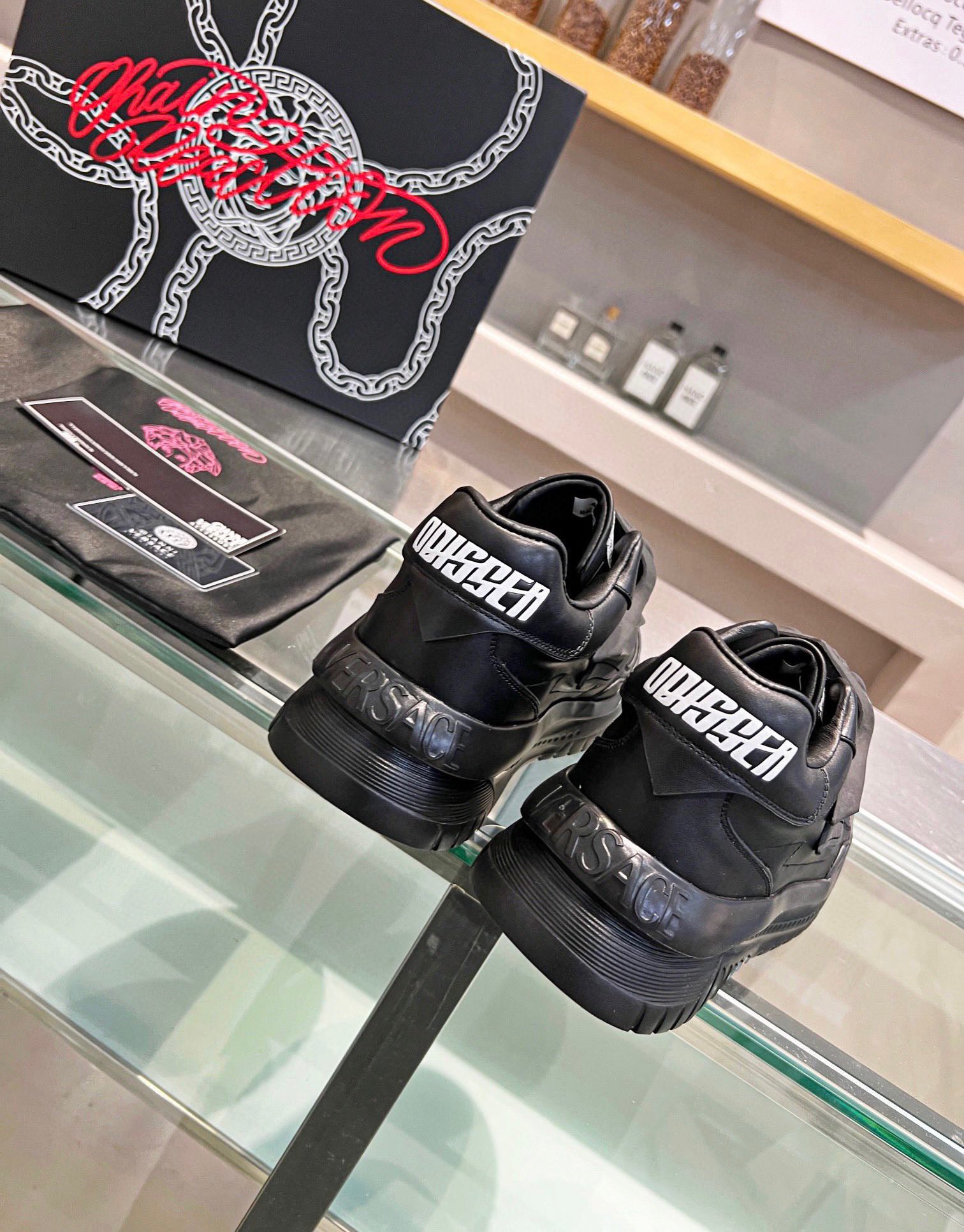 Designed by Versace’s in-house team, the shoe is comprised of a sleek leather upper with futuristic design elements and a multi-layer composition. A rounded toe with a perforated toe box leads the top of the sneaker to a 3D rubber lace guard that features an enlarged, laser-cut “Medusa” plaque. The tongue incorporates a fabric label tag with the “Versace” and “Odissea” font logo branding.