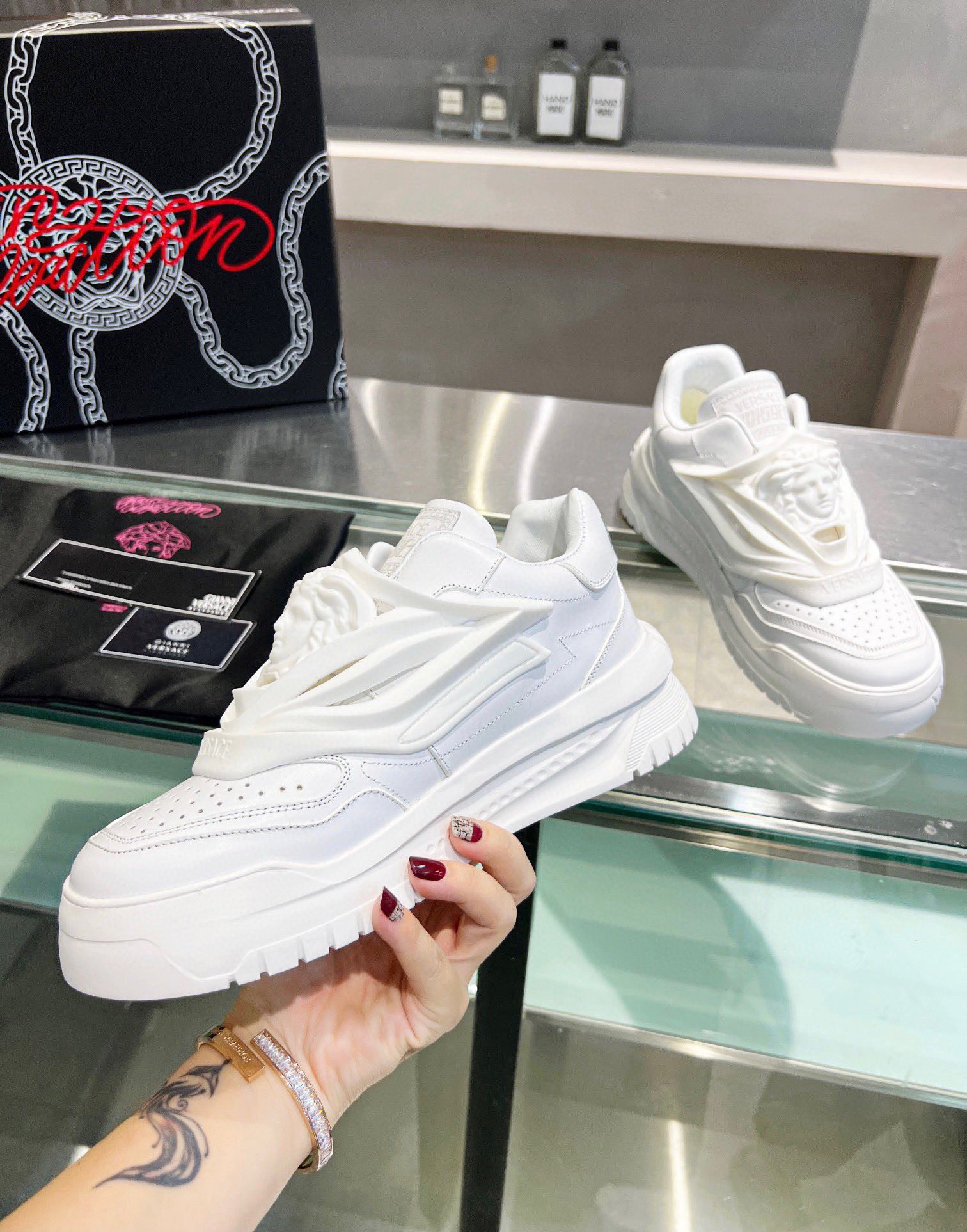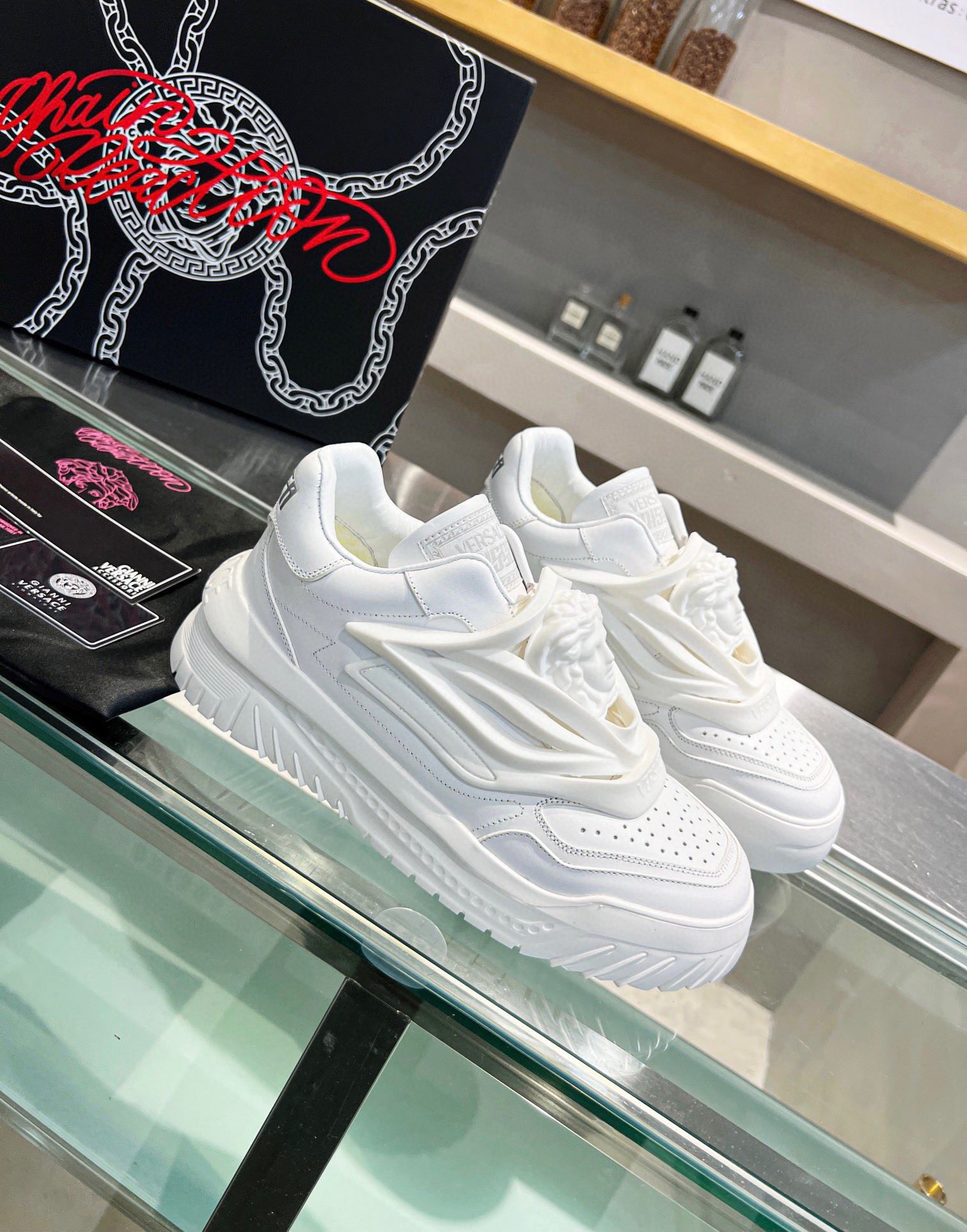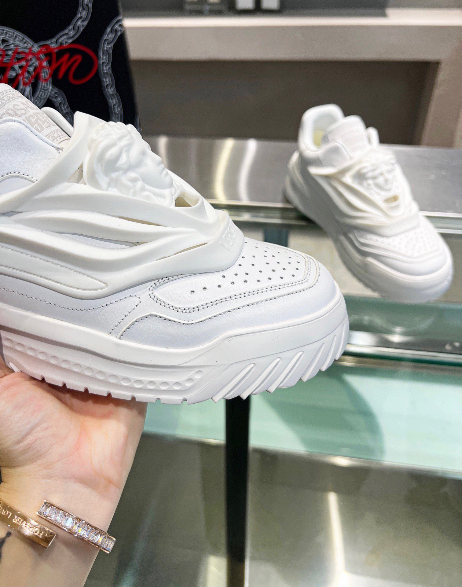 Designed by Versace’s in-house team, the shoe is comprised of a sleek leather upper with futuristic design elements and a multi-layer composition. A rounded toe with a perforated toe box leads the top of the sneaker to a 3D rubber lace guard that features an enlarged, laser-cut “Medusa” plaque. The tongue incorporates a fabric label tag with the “Versace” and “Odissea” font logo branding.