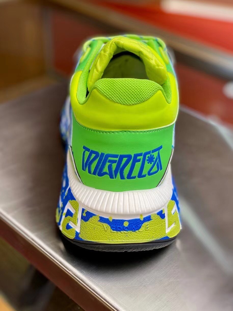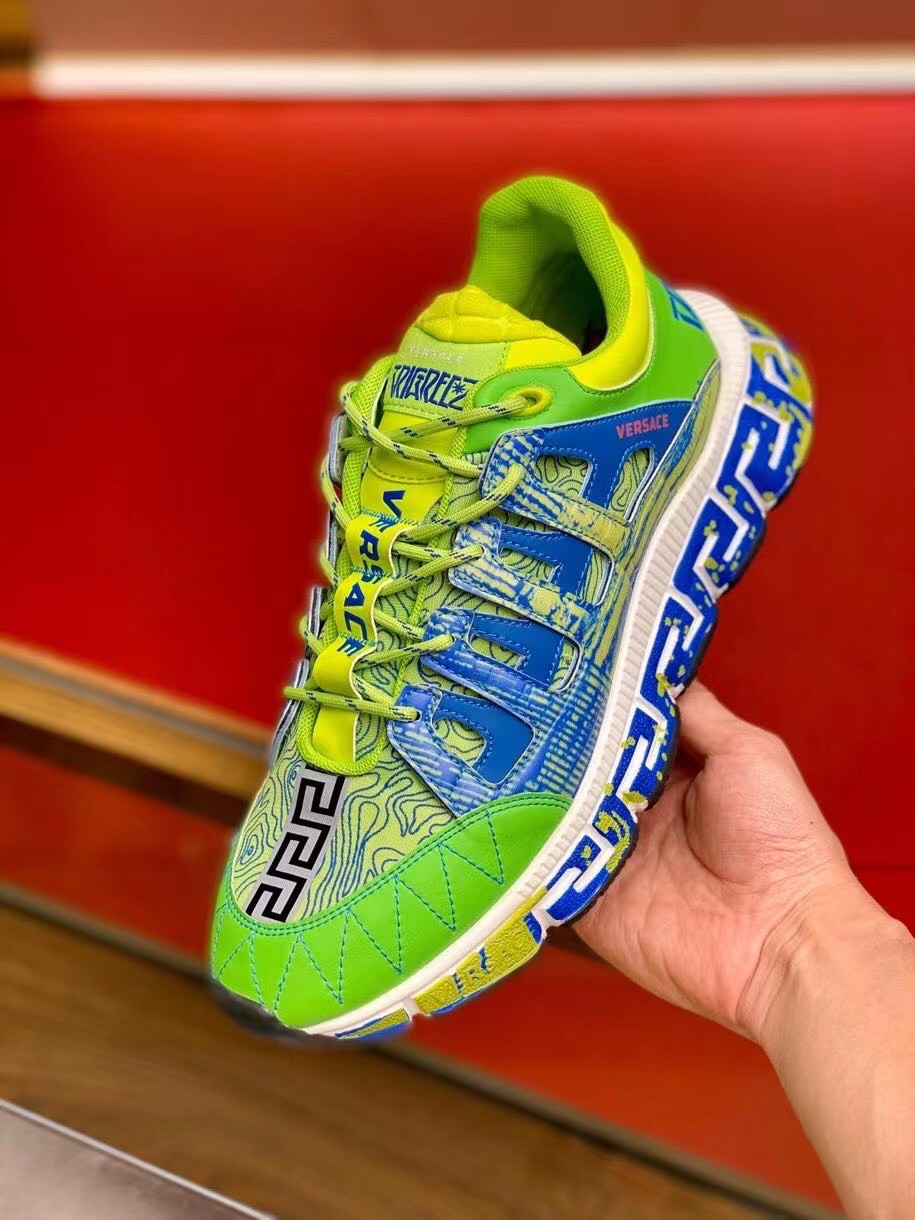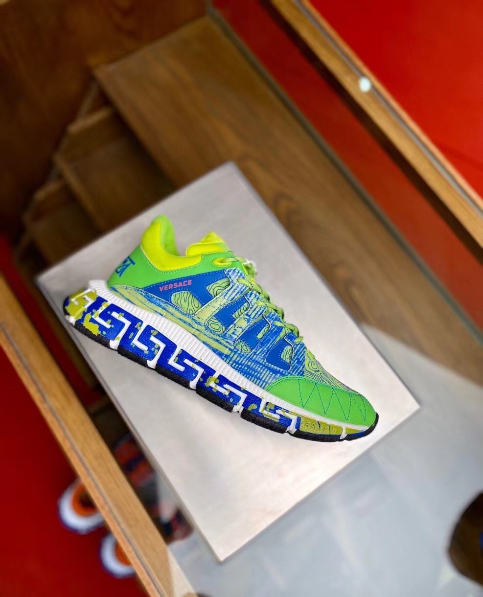 The geographical coordinates of Versace’s Milan HQ are printed along the upper. Other details include a hidden 3D Medusa in the sole and a cork Greca Cushioning System. Versace’s Trigreca sneaker is characteristically maximalist, featuring a chunky shape and busy upper with overlays and a mixed material construction.