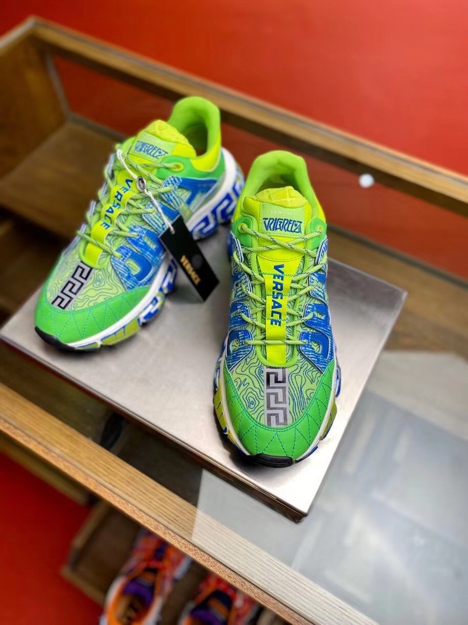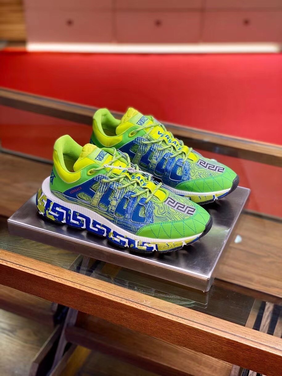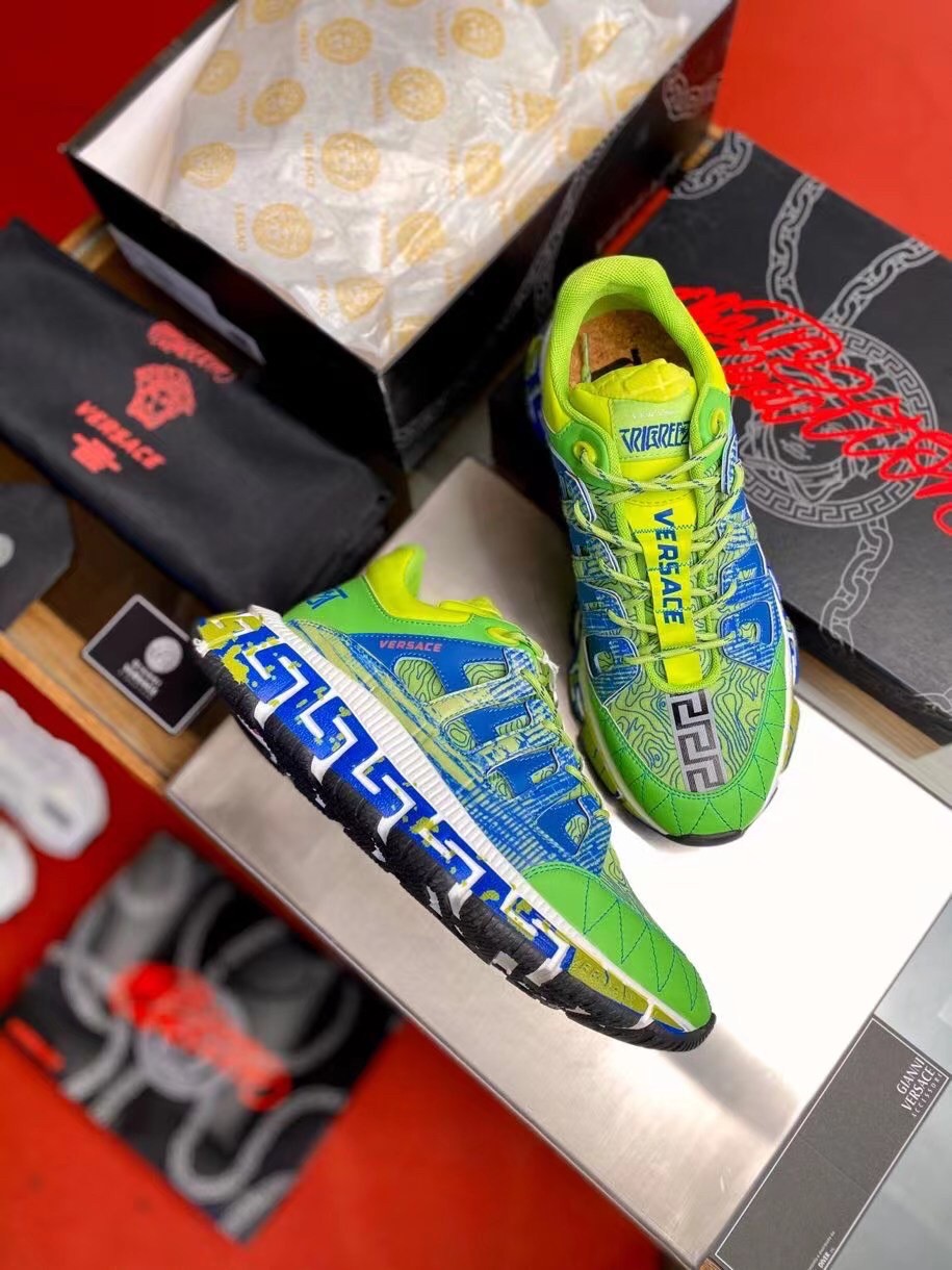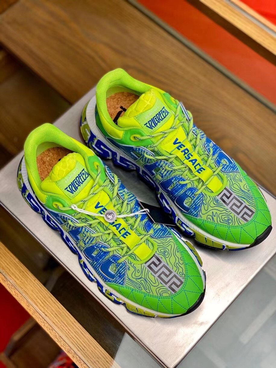 The geographical coordinates of Versace’s Milan HQ are printed along the upper. Other details include a hidden 3D Medusa in the sole and a cork Greca Cushioning System. Versace’s Trigreca sneaker is characteristically maximalist, featuring a chunky shape and busy upper with overlays and a mixed material construction.